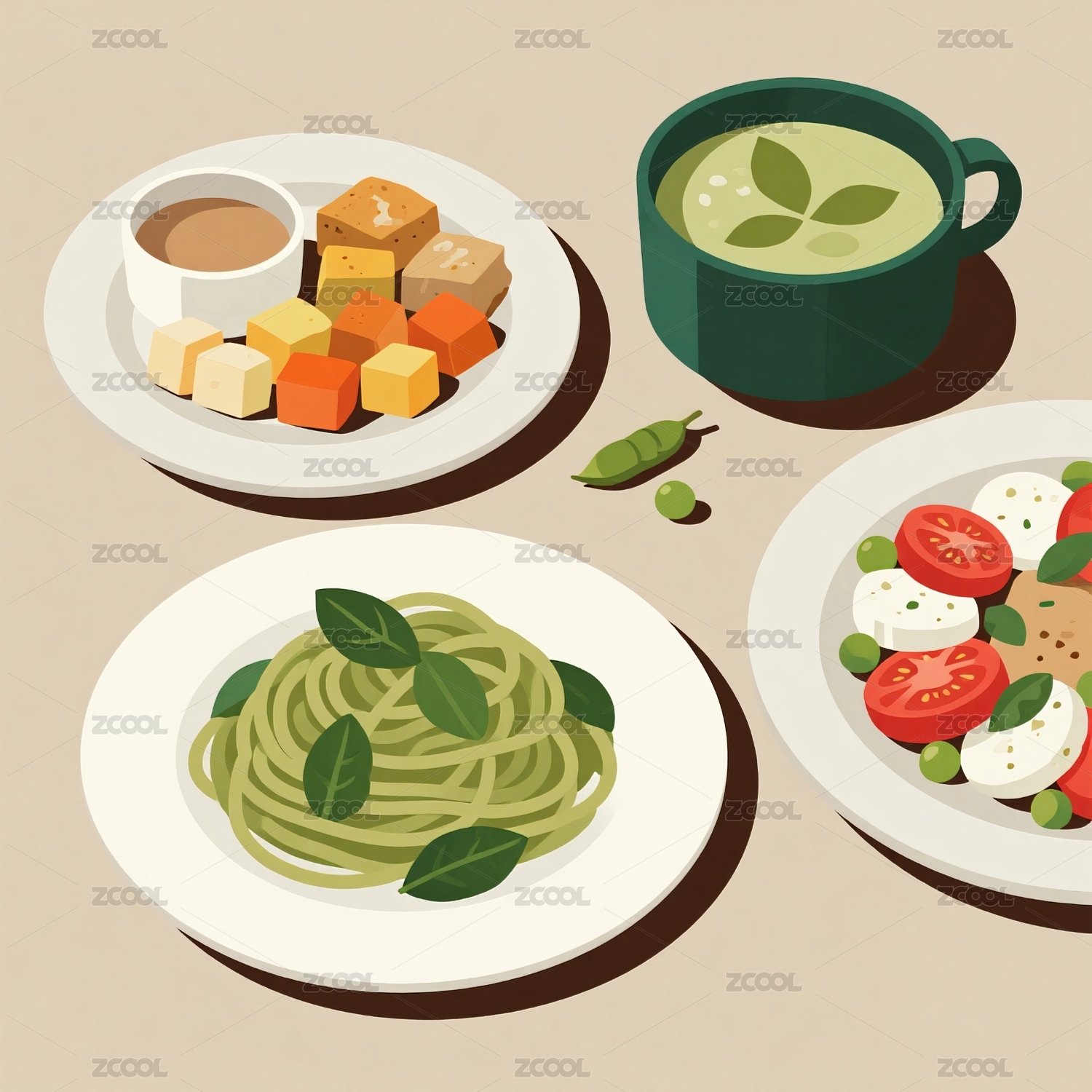 多种美食摆盘展示搭配餐具