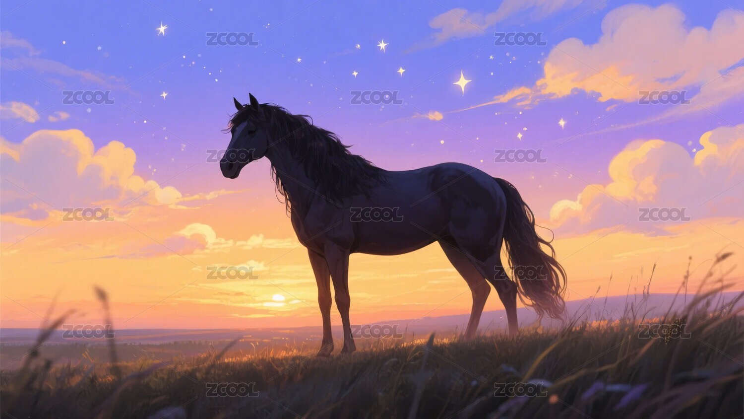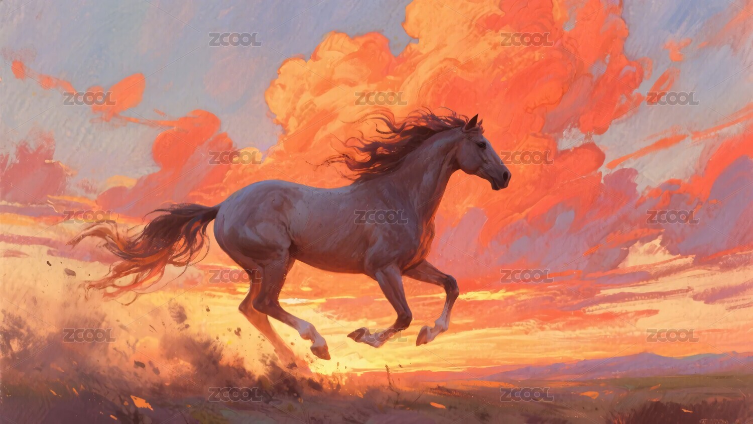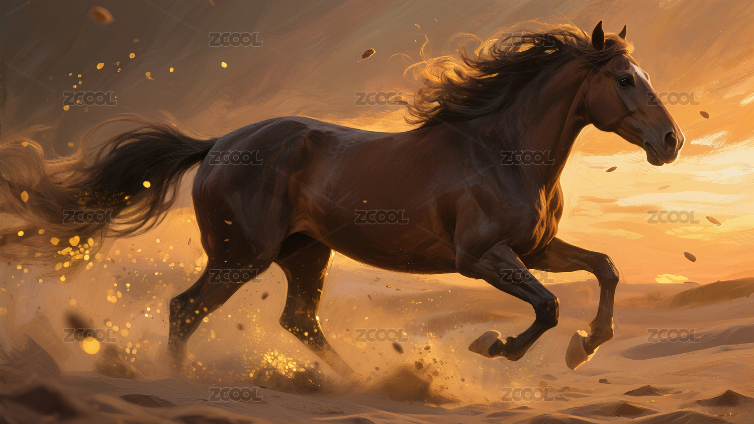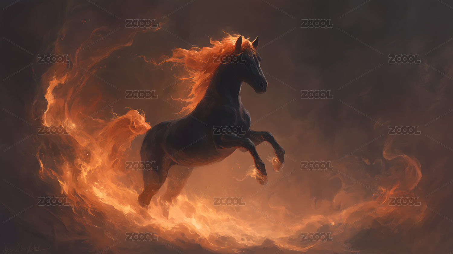 火焰奔腾的黑色骏马翱翔于黑暗中