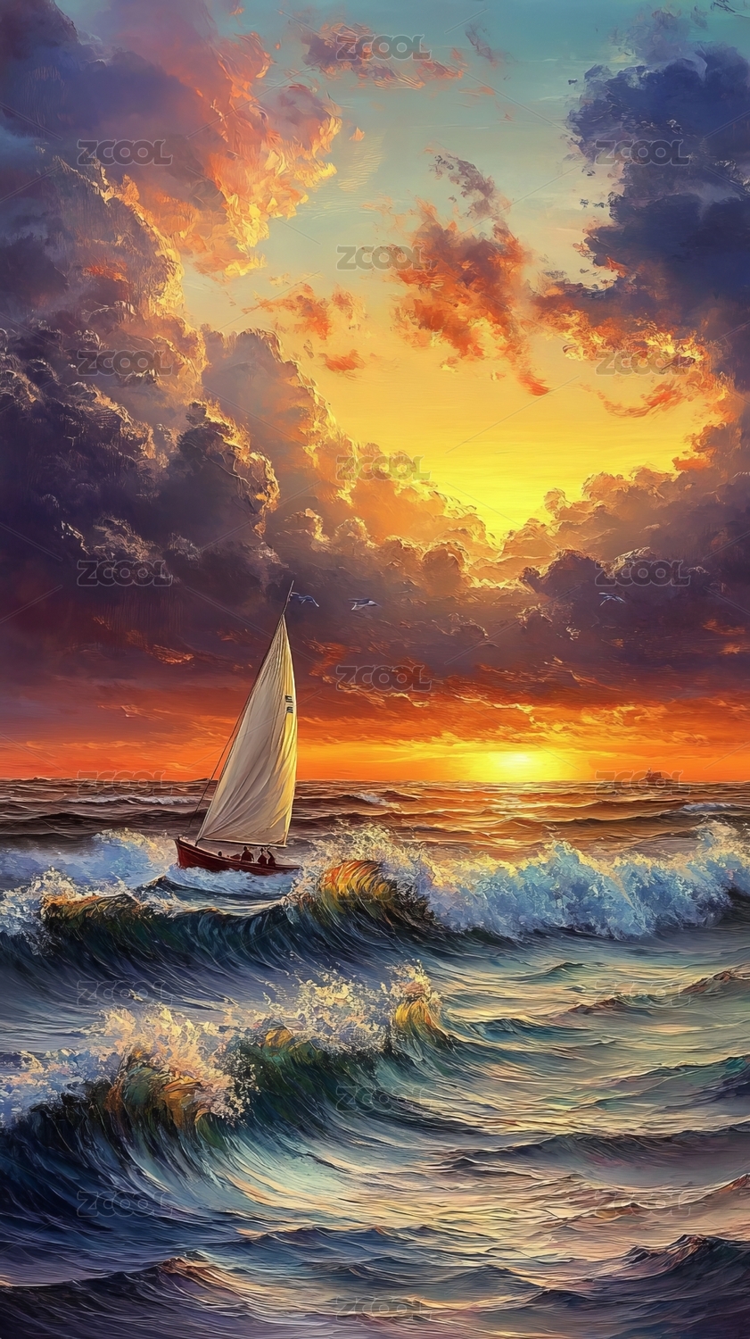 动漫风海洋中唯美夕阳下的云彩和帆船