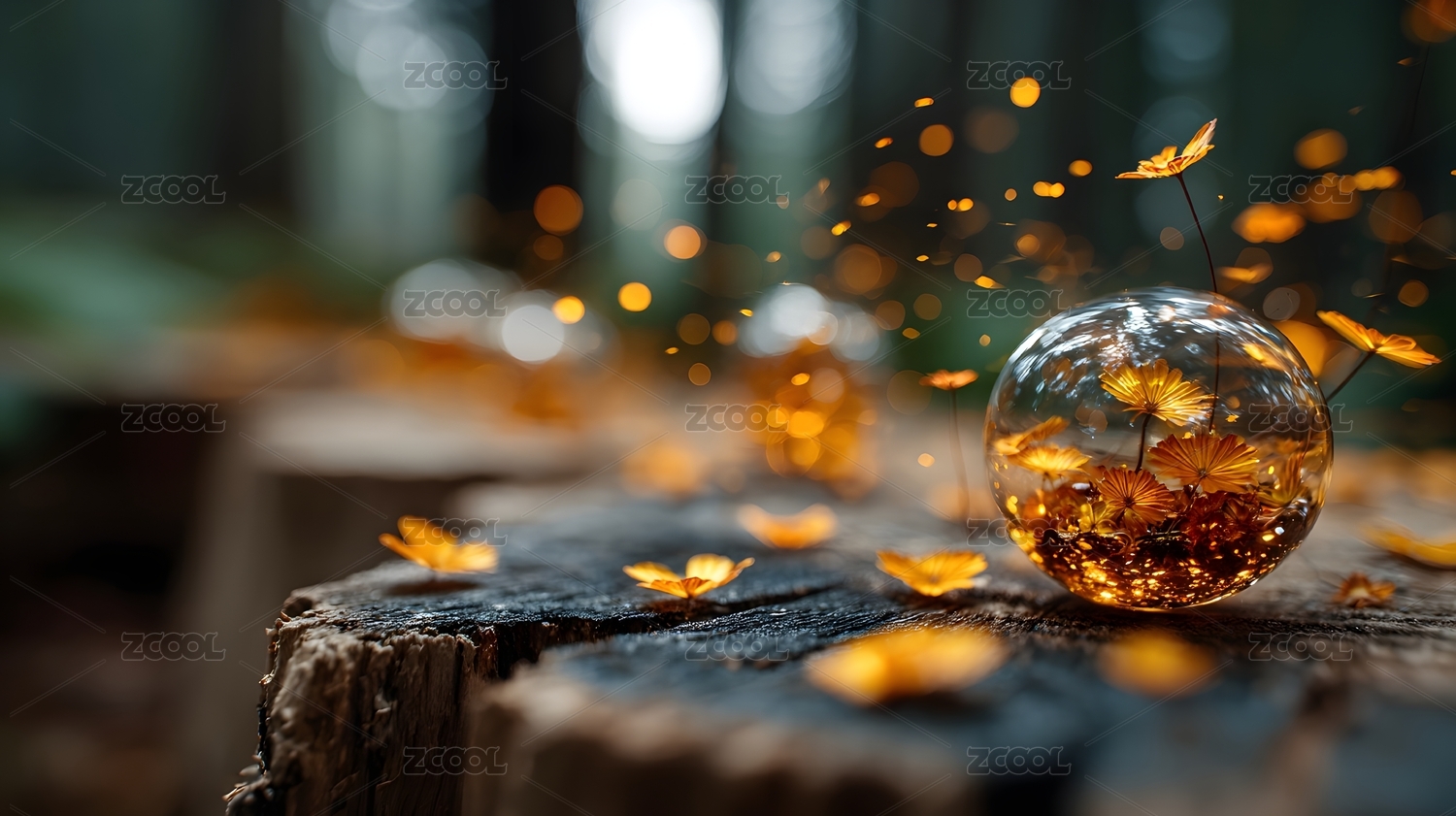 水晶球,树,金色,树叶,树干,底座,光斑,倒影,黑色,背景