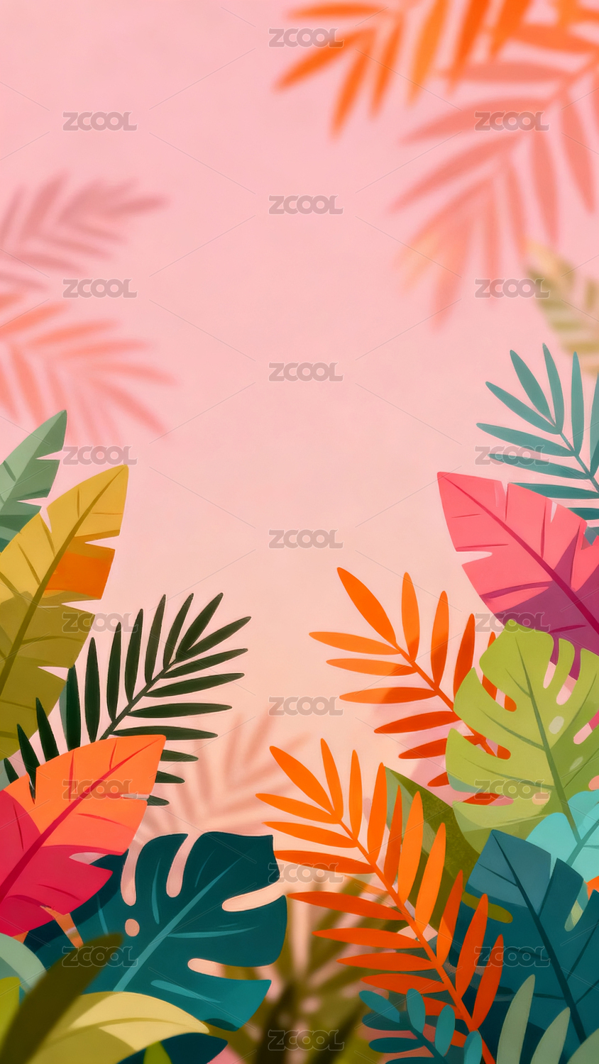 抽象花卉绿色叶子和橙色油漆飞溅背景