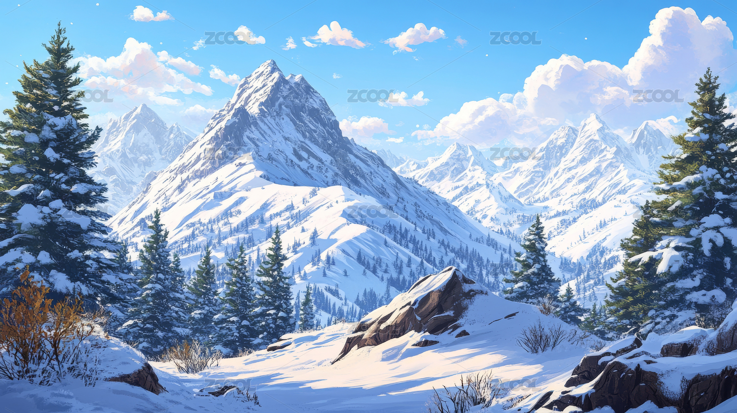 冬季雪天暴风雪过后的晴朗天空户外场景插画