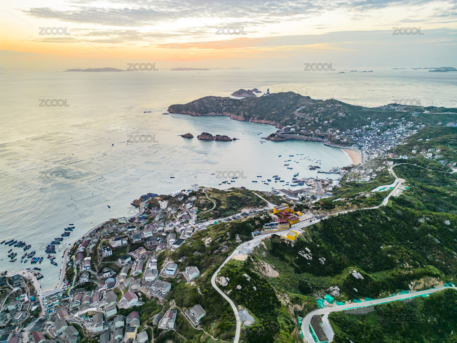 航拍晚霞时福建平潭岛的海岛城镇和海洋风景