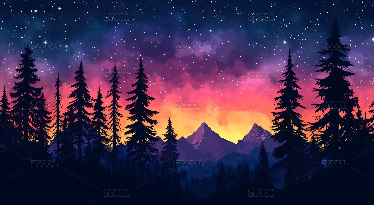 山脉,森林,星空,月亮,紫色,水彩,梦幻,夜晚,风景,唯美