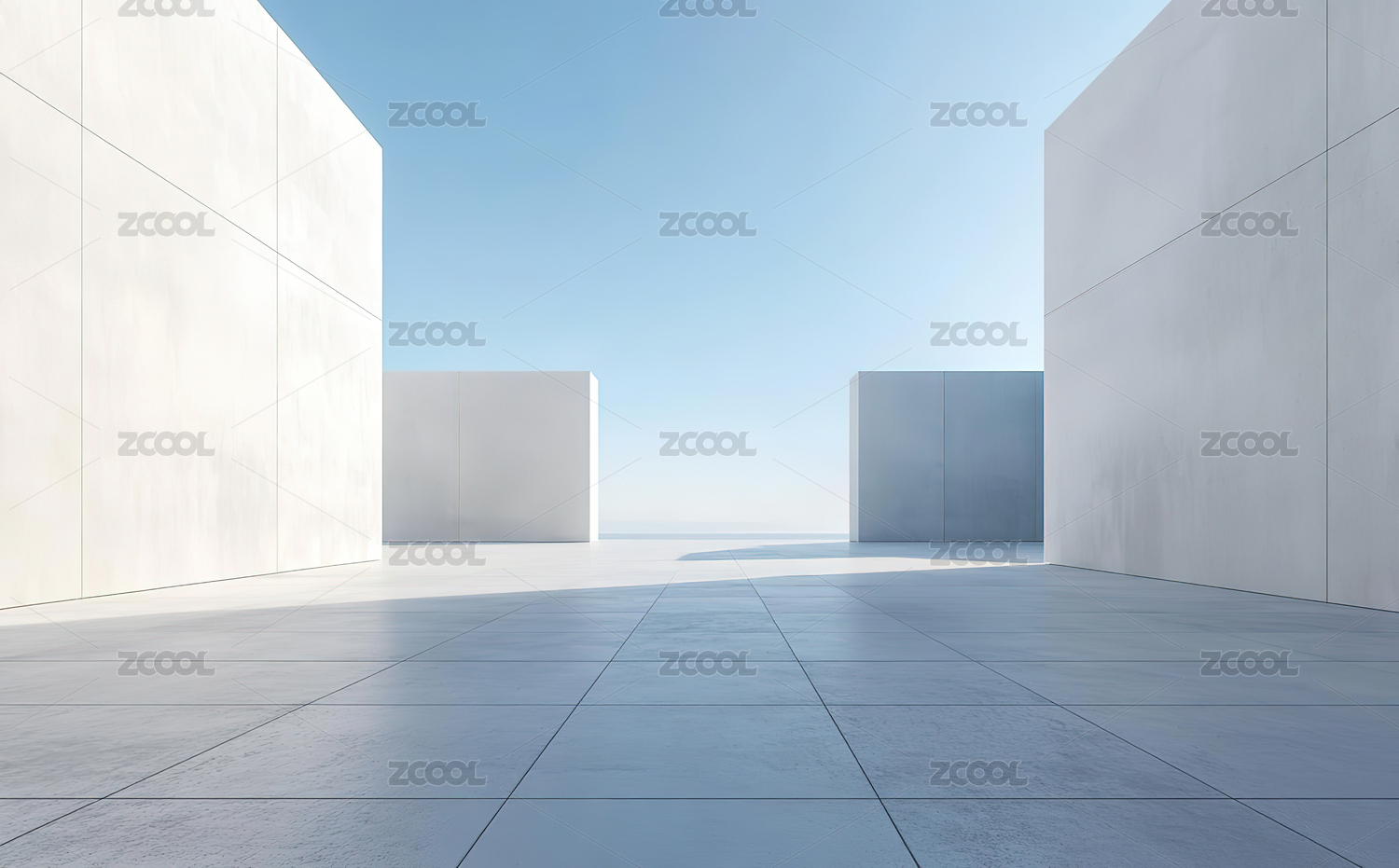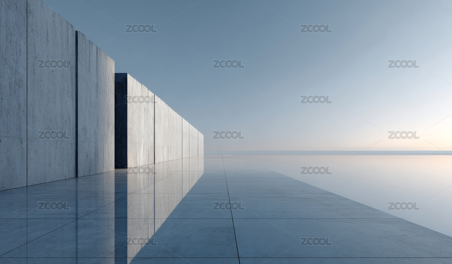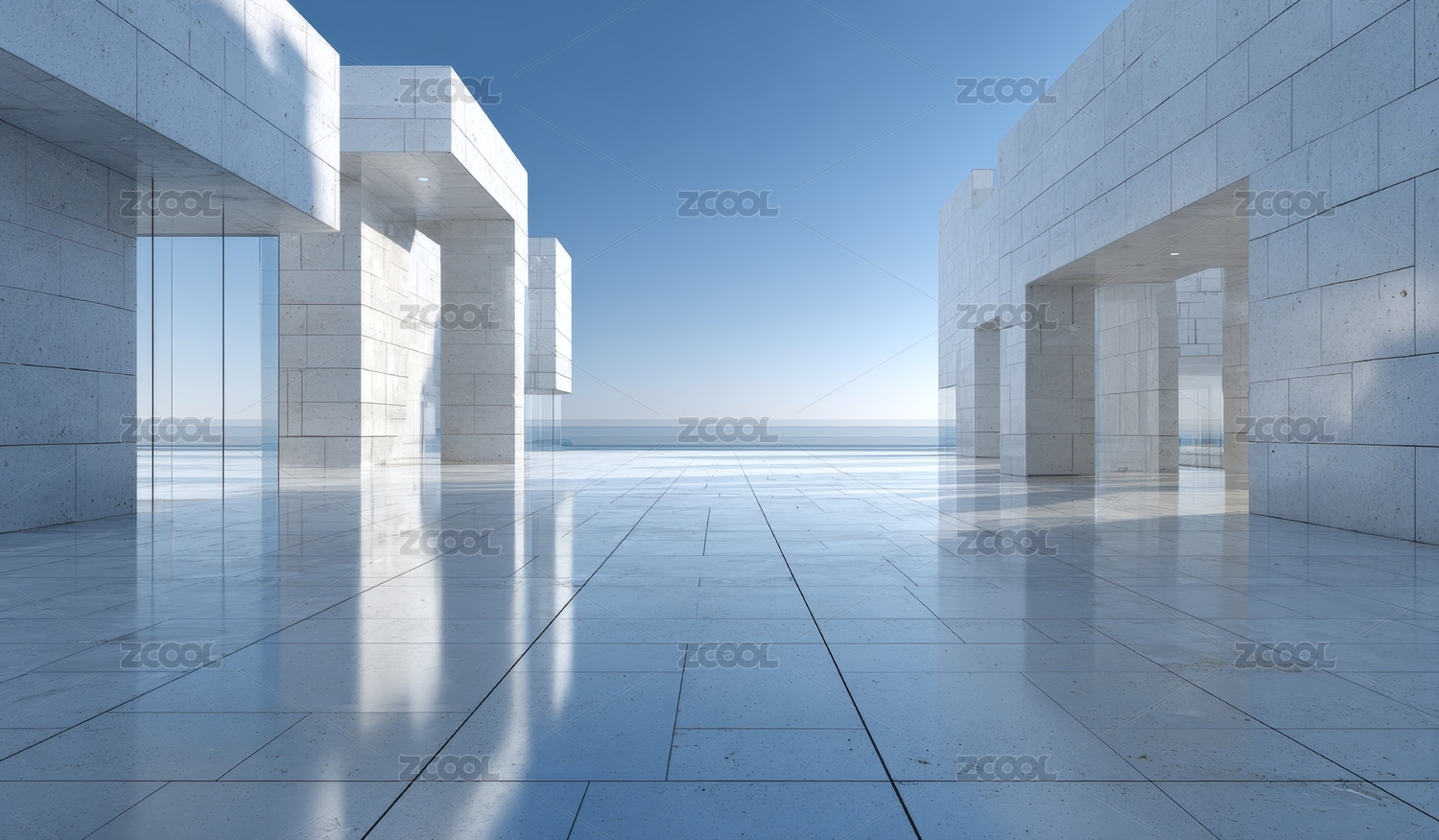 现代建筑,几何形状,混凝土墙面,平滑地面,反射效果,蓝天,海景,水平线,简约风格,对称布局
