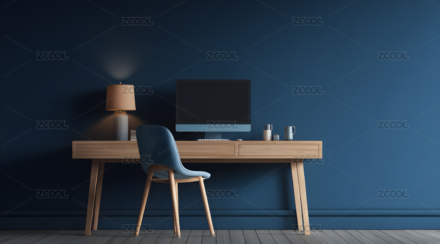 蓝色墙面电脑摆设
