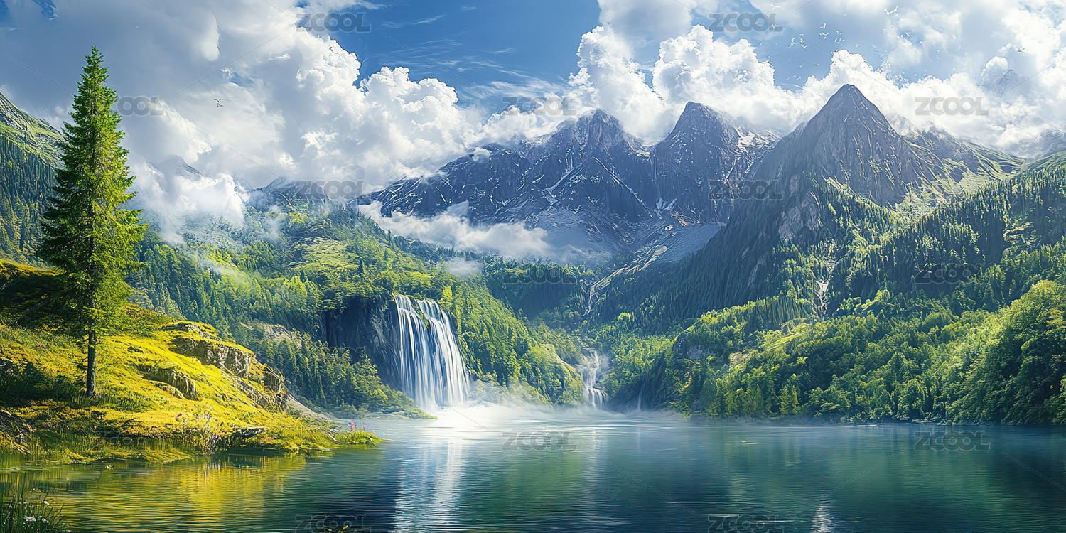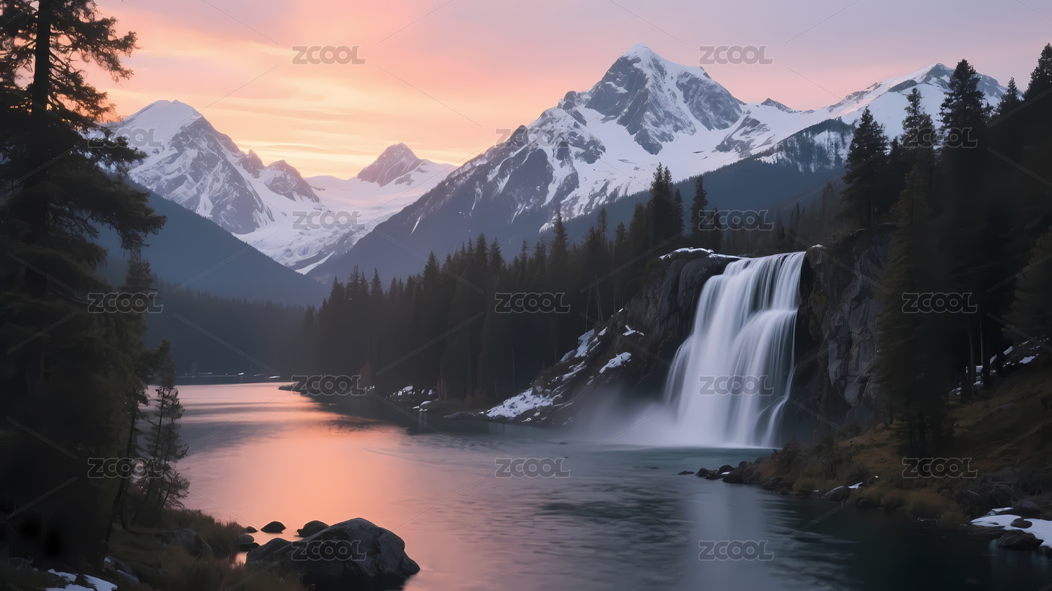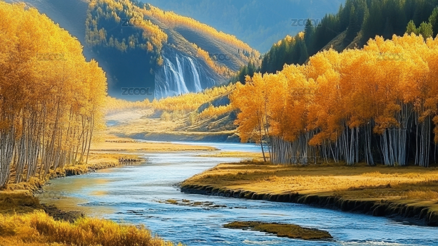 金色,自然,山脉,意境,宁静,瀑布,树林,景色,清新,冬季