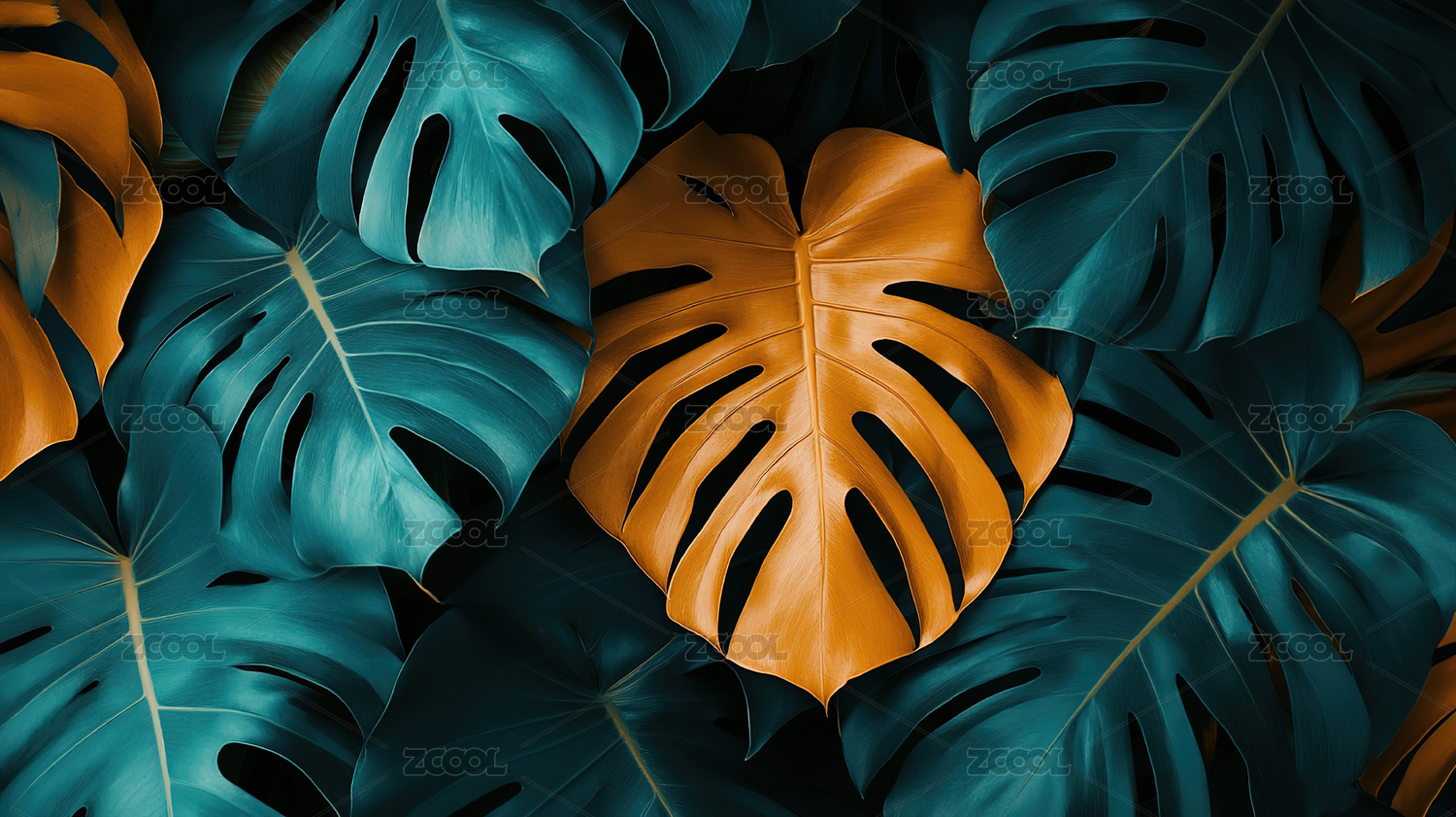 深蓝色和霓虹橙色热带树叶的活力矢量插图