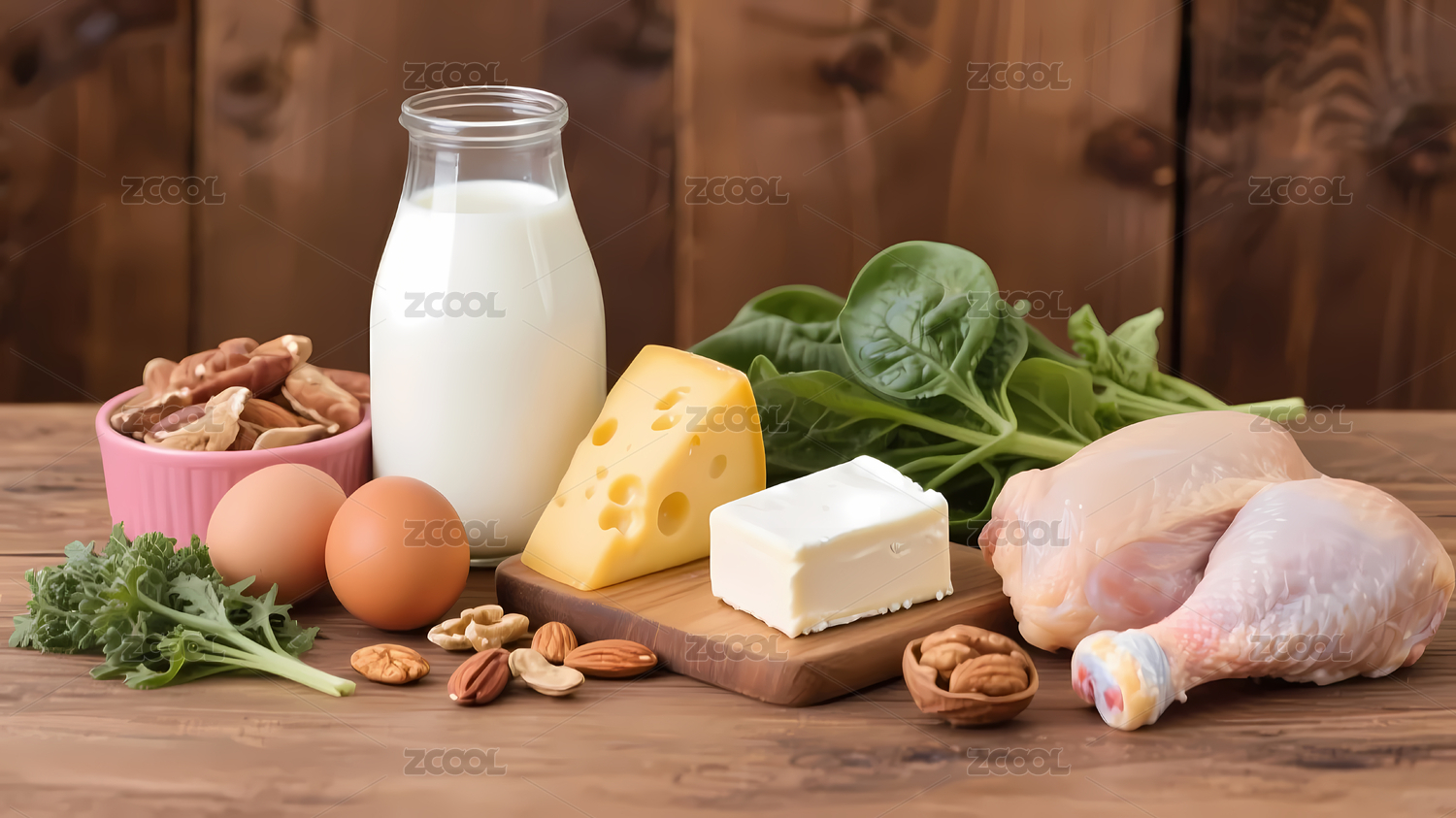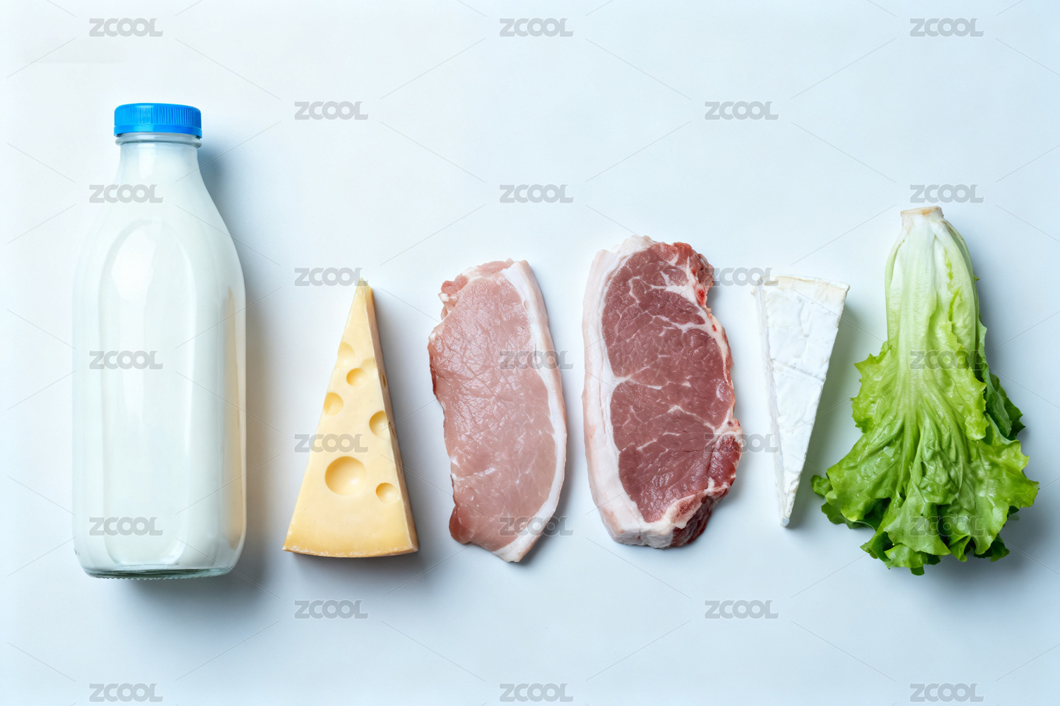 浅色背景上的瓜果蔬菜牛奶鱼肉等食材