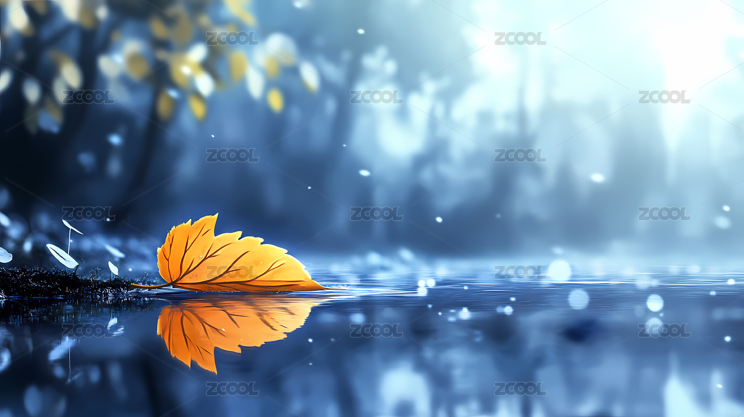 枫叶,秋天,水面,反射,黄色,夜晚,雨后,森林,静谧,宁静
