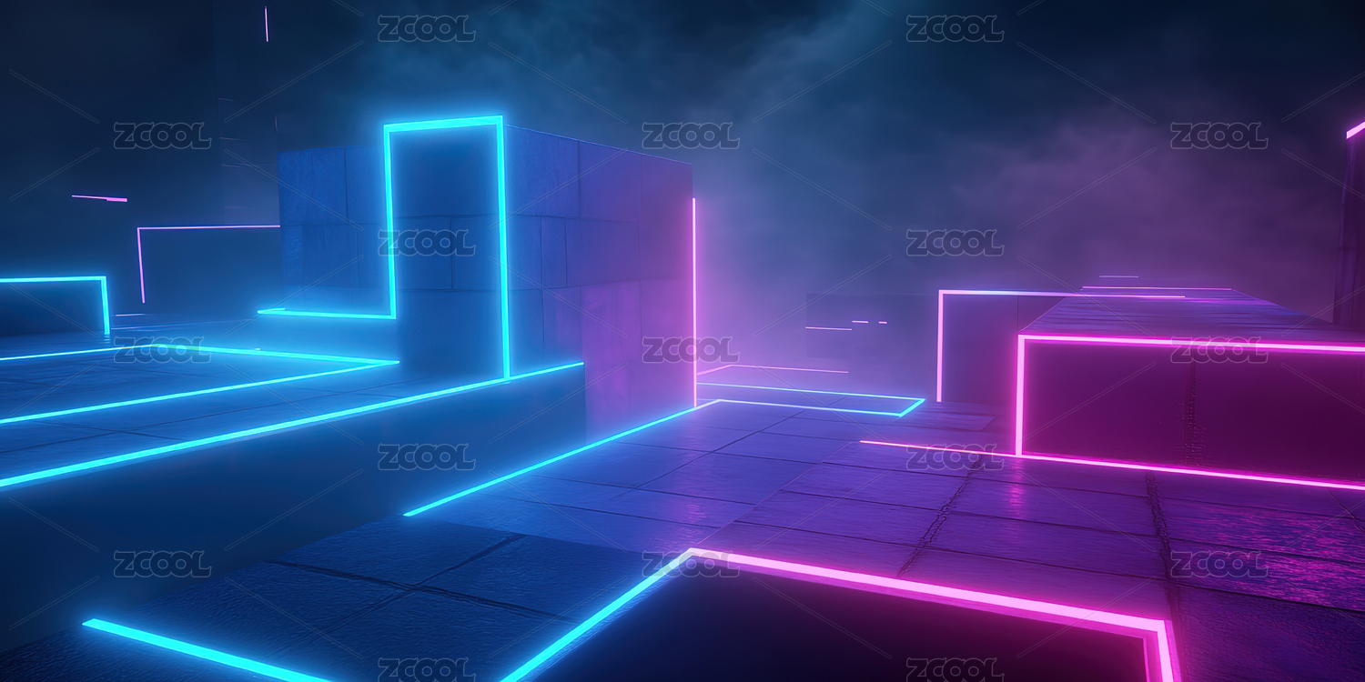 紫色几何方块与雾气环境