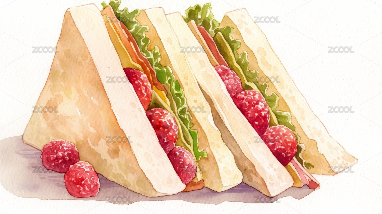 早餐桌面盘中夹蔬菜火腿的三明治3插画绘画