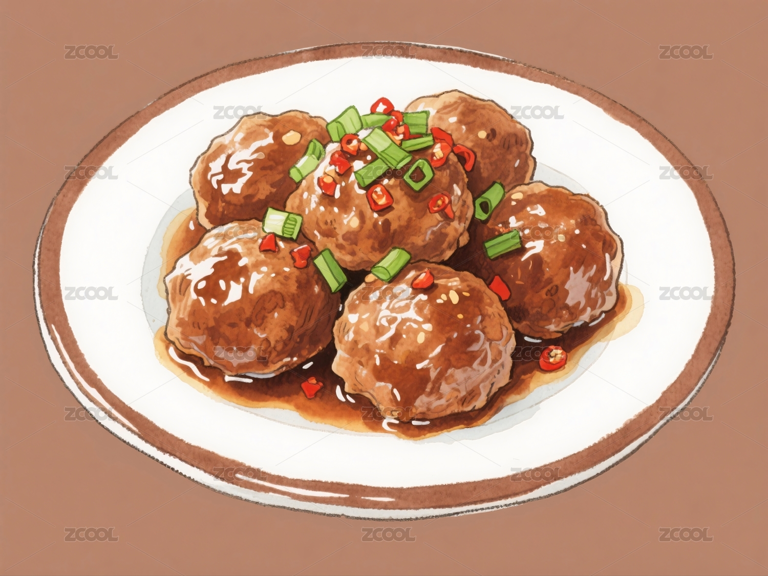 一碗美味的红烧狮子头水彩插画