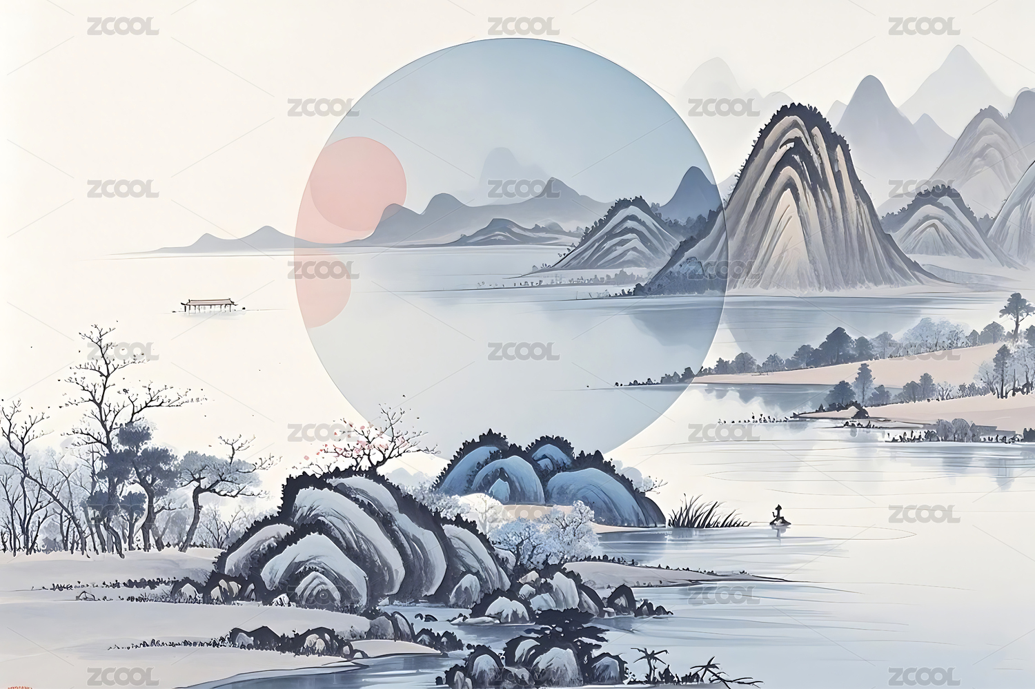 圆形古风水墨山水意境风景画