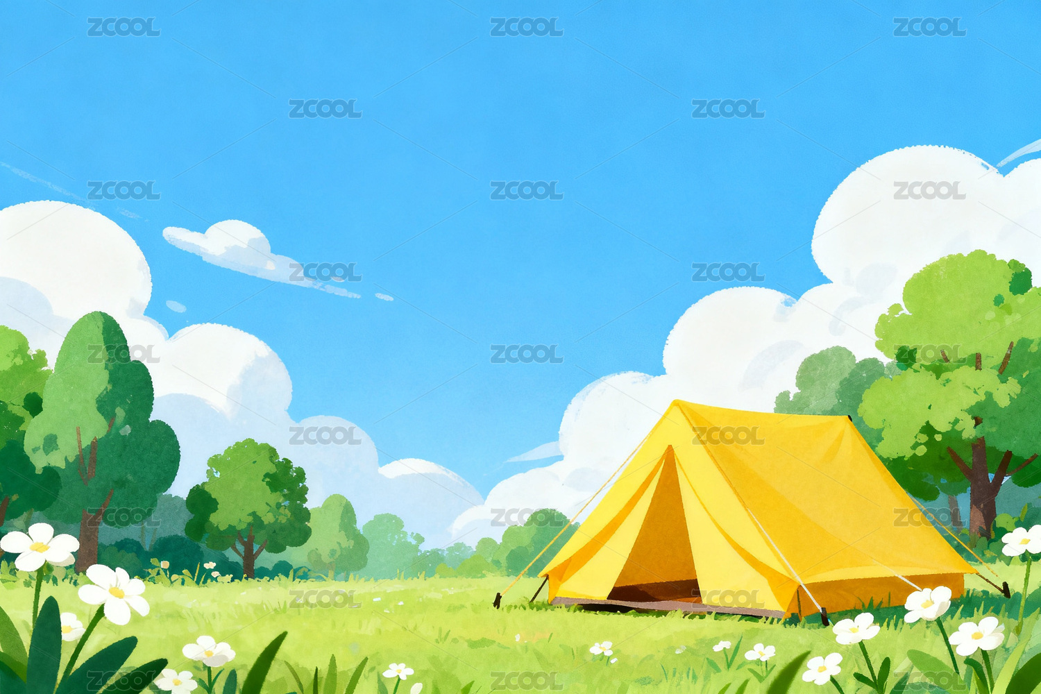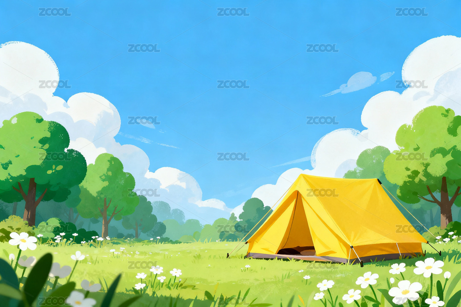蓝天绿树下的黄色帐篷露营场景