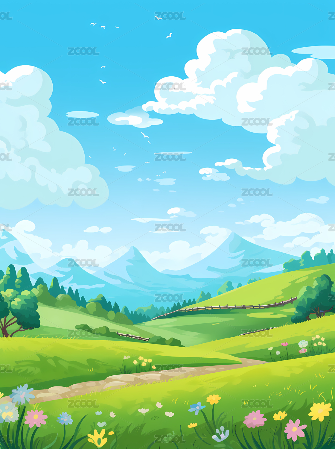 春天鲜花草地蓝天白云田园风光清新卡通背景