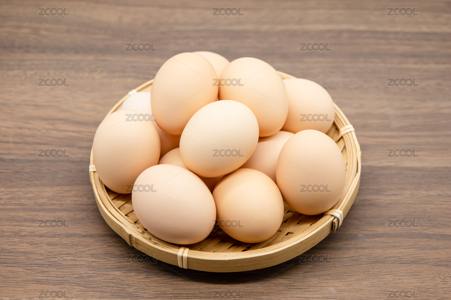 木质底纹上的竹笸箩装满了美味的油鸡蛋