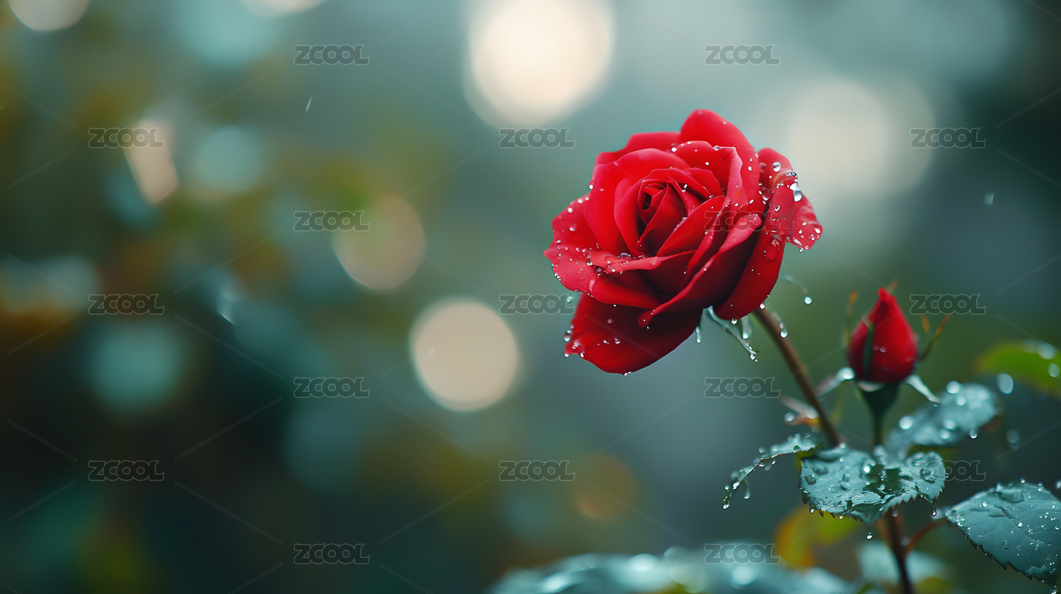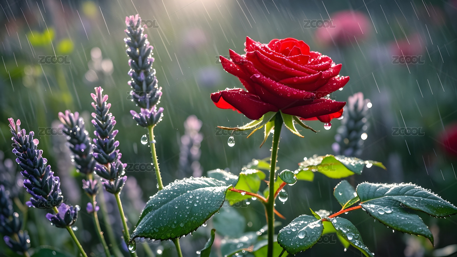 美丽的玫瑰在风中摇曳,雨滴落下并溅起水珠