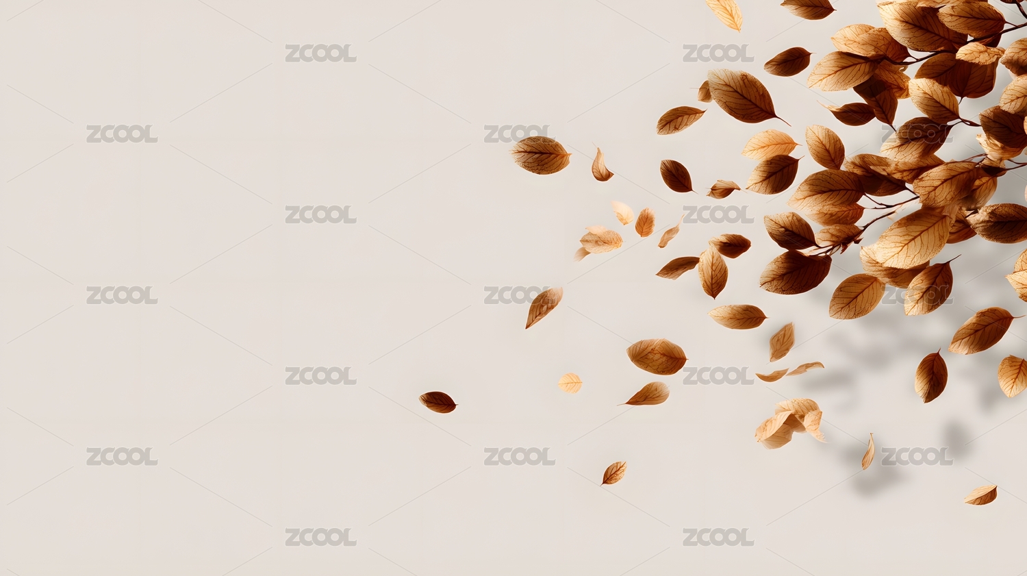 飘落的棕黄色树叶于浅色背景