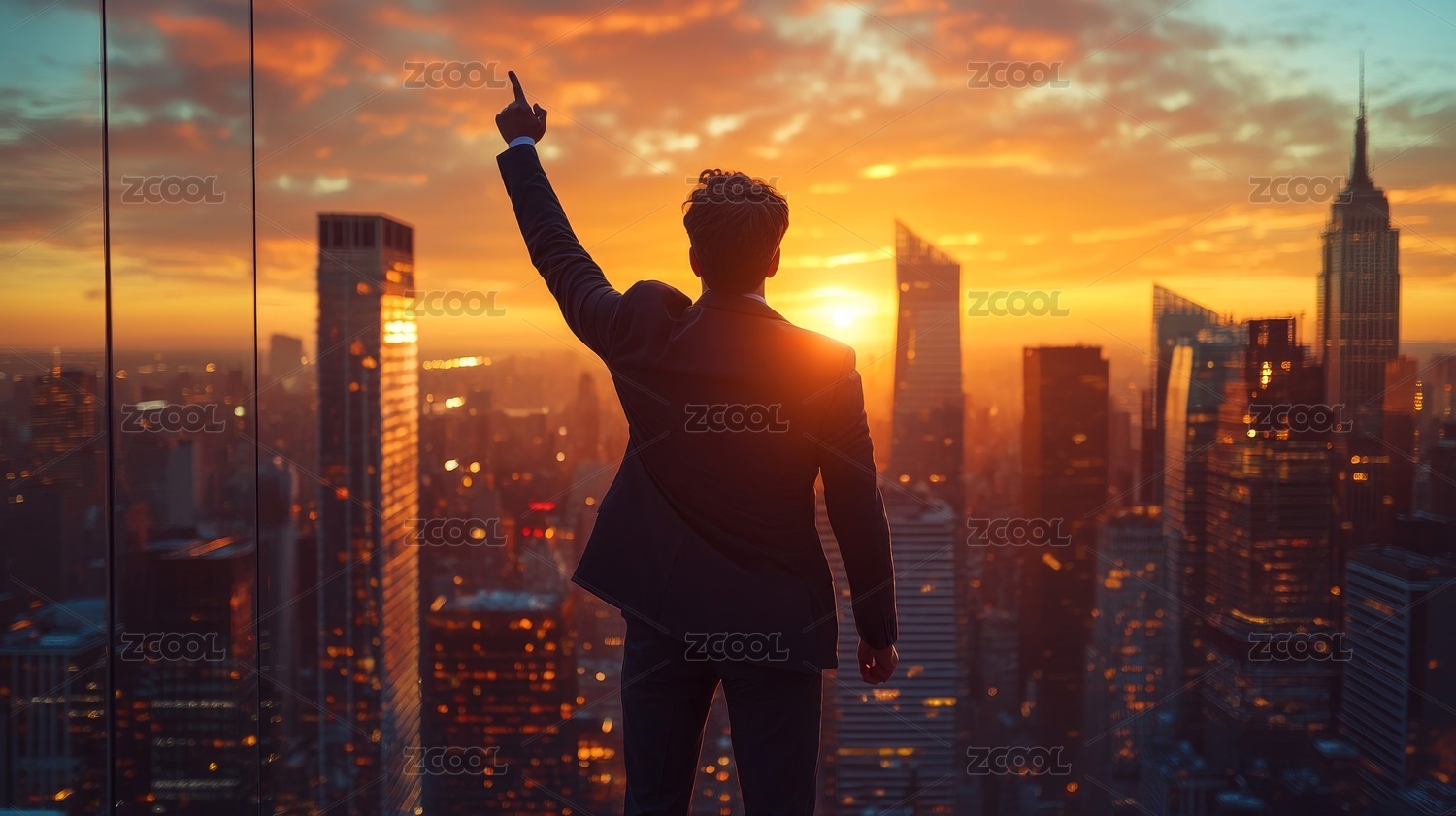 年轻商人站在透明玻璃顶楼遥望宏伟的城日出