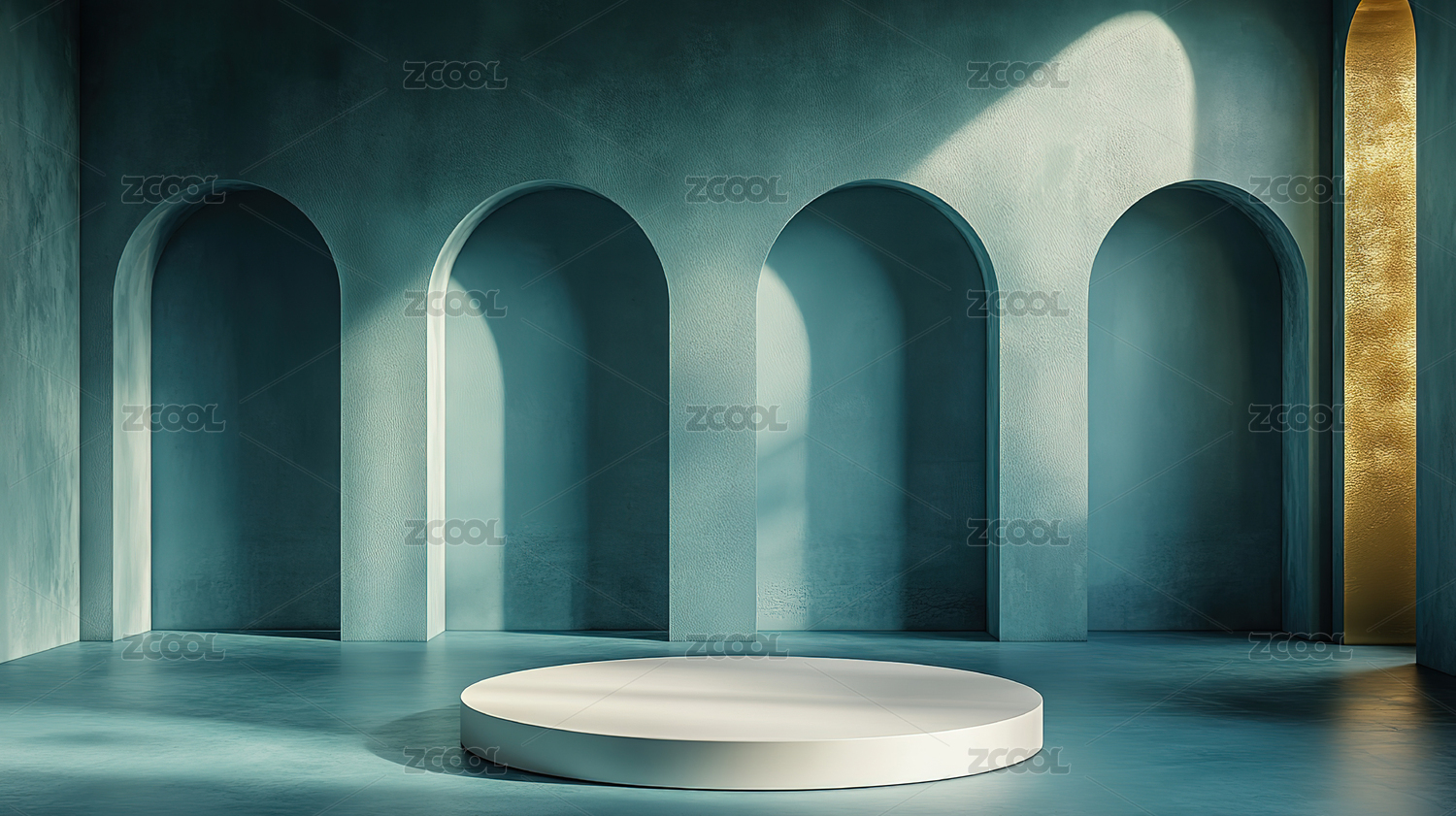 蓝墙,金拱,圆台,光影,纹路,地面,展台,空间,柔和,清新