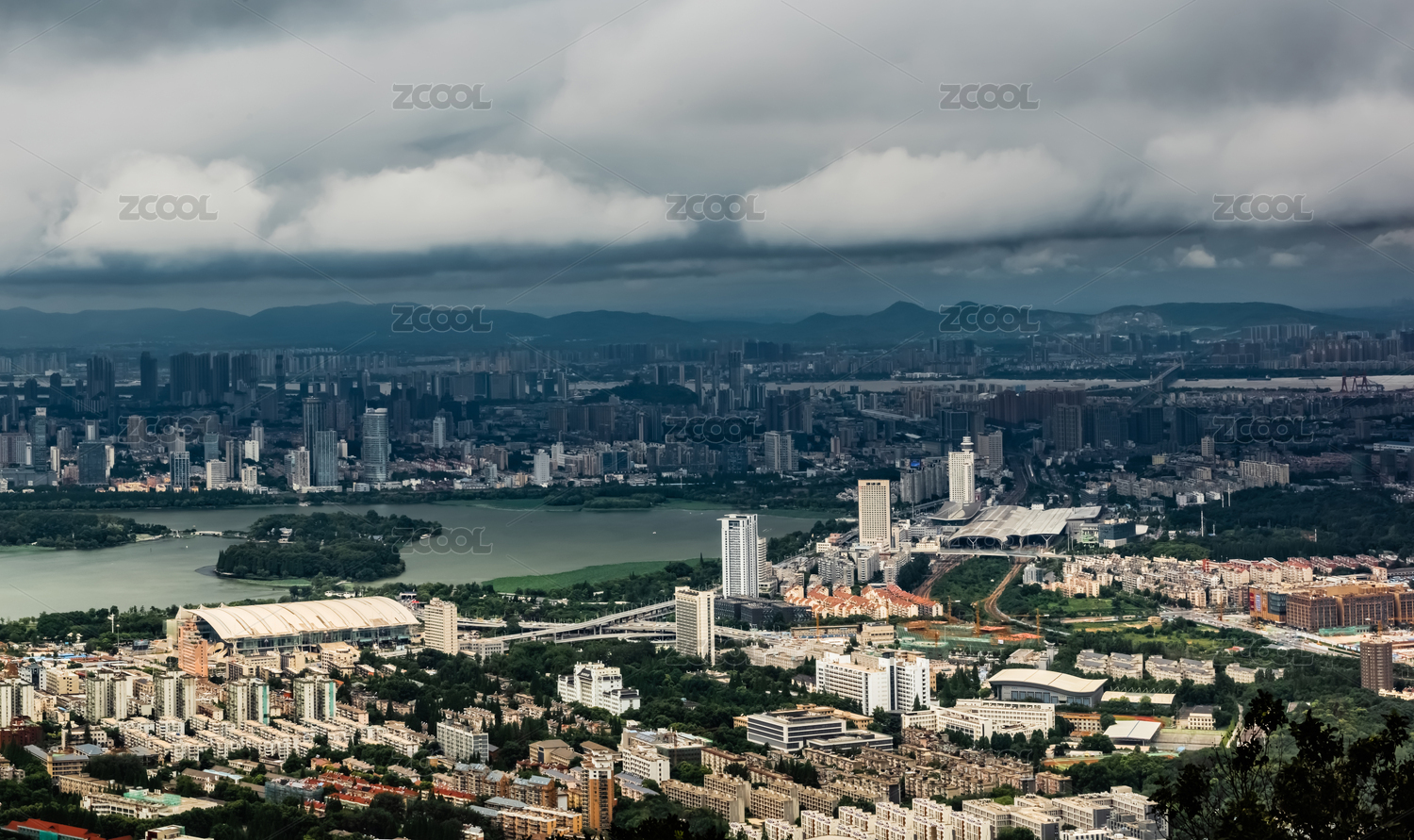 江苏省南京市乌云密布玄武湖畔高楼建筑