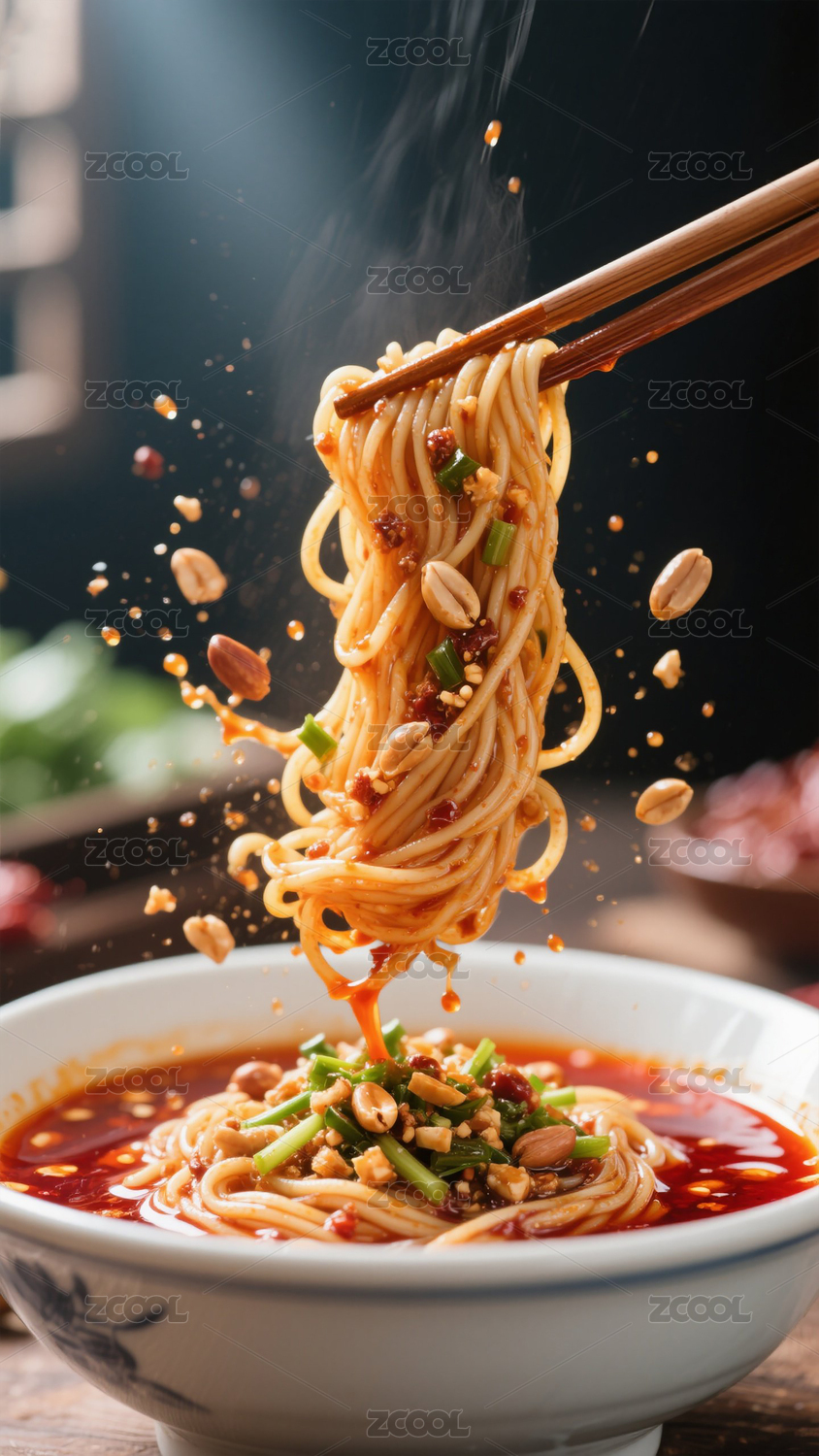 被筷子夹起的沾满红油的四川担担面