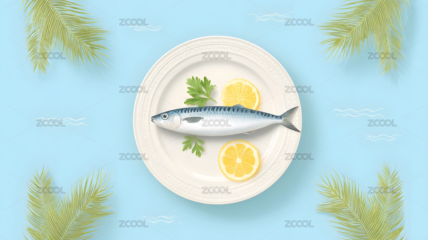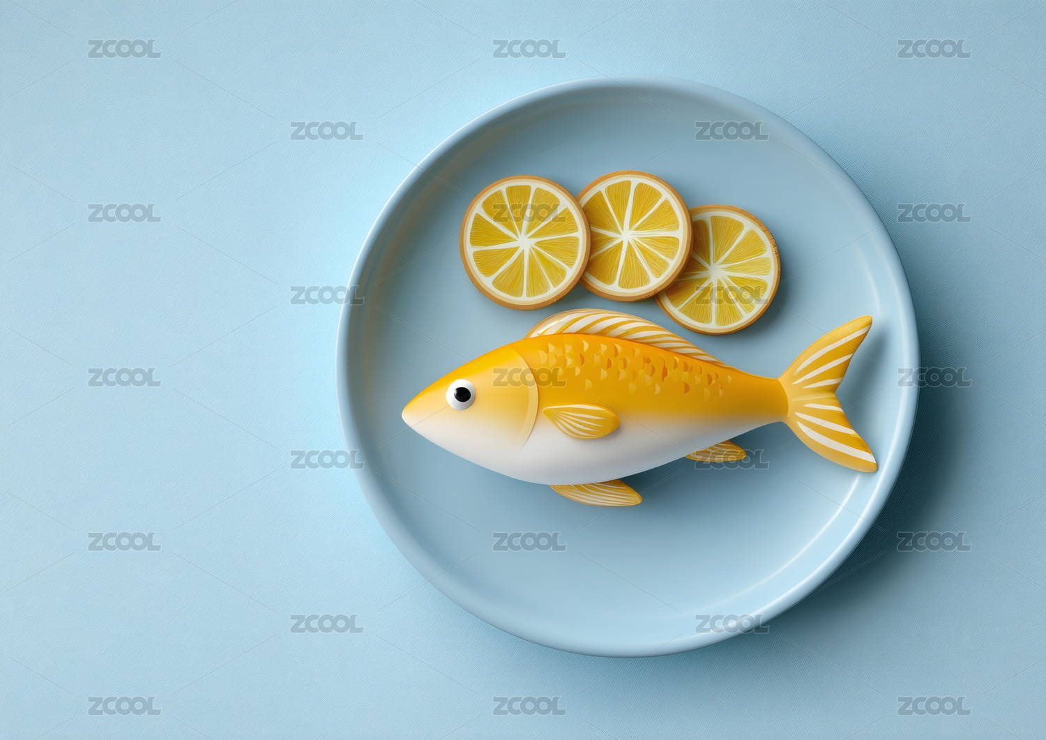 现代,清新,健康,可爱,简约,装饰,鱼,柠檬,黄瓜,盘子
