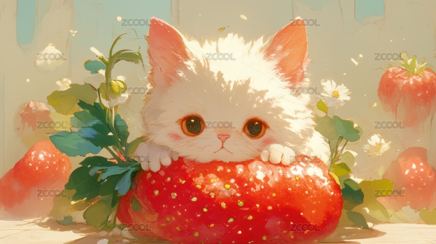 卡通可爱猫西瓜水果食物开心温暖治愈插画