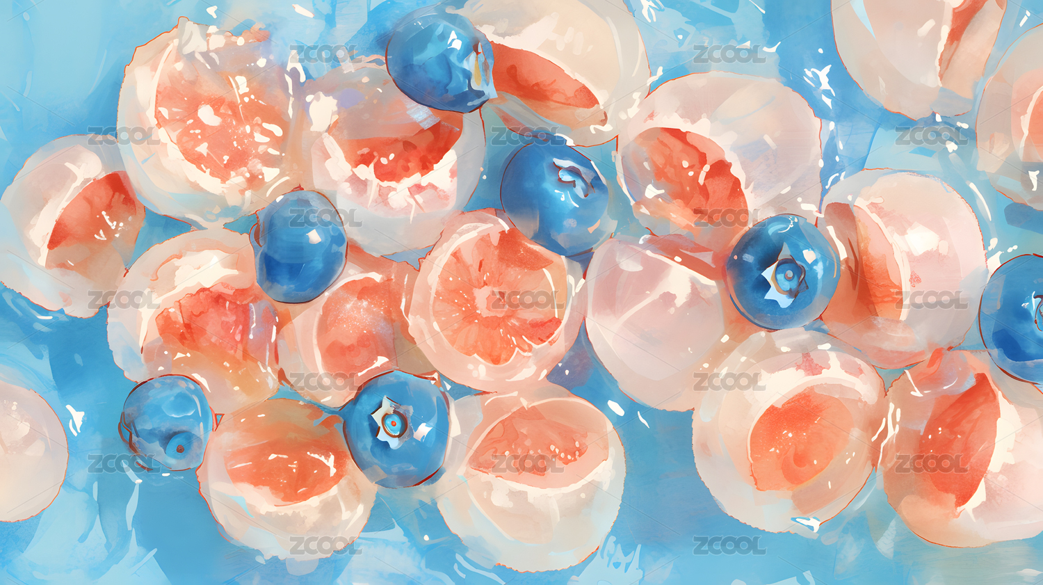 水彩画风格水果蓝莓混合冰块