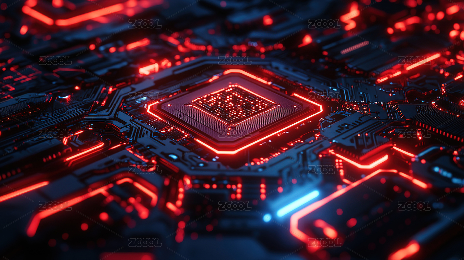 未来科技感十足的蓝色芯片电路板特写