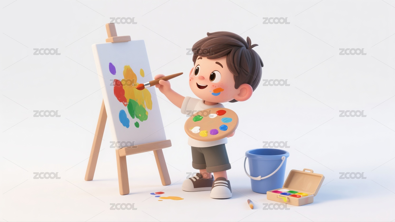 3d风格一个小男孩正在画画场景插画