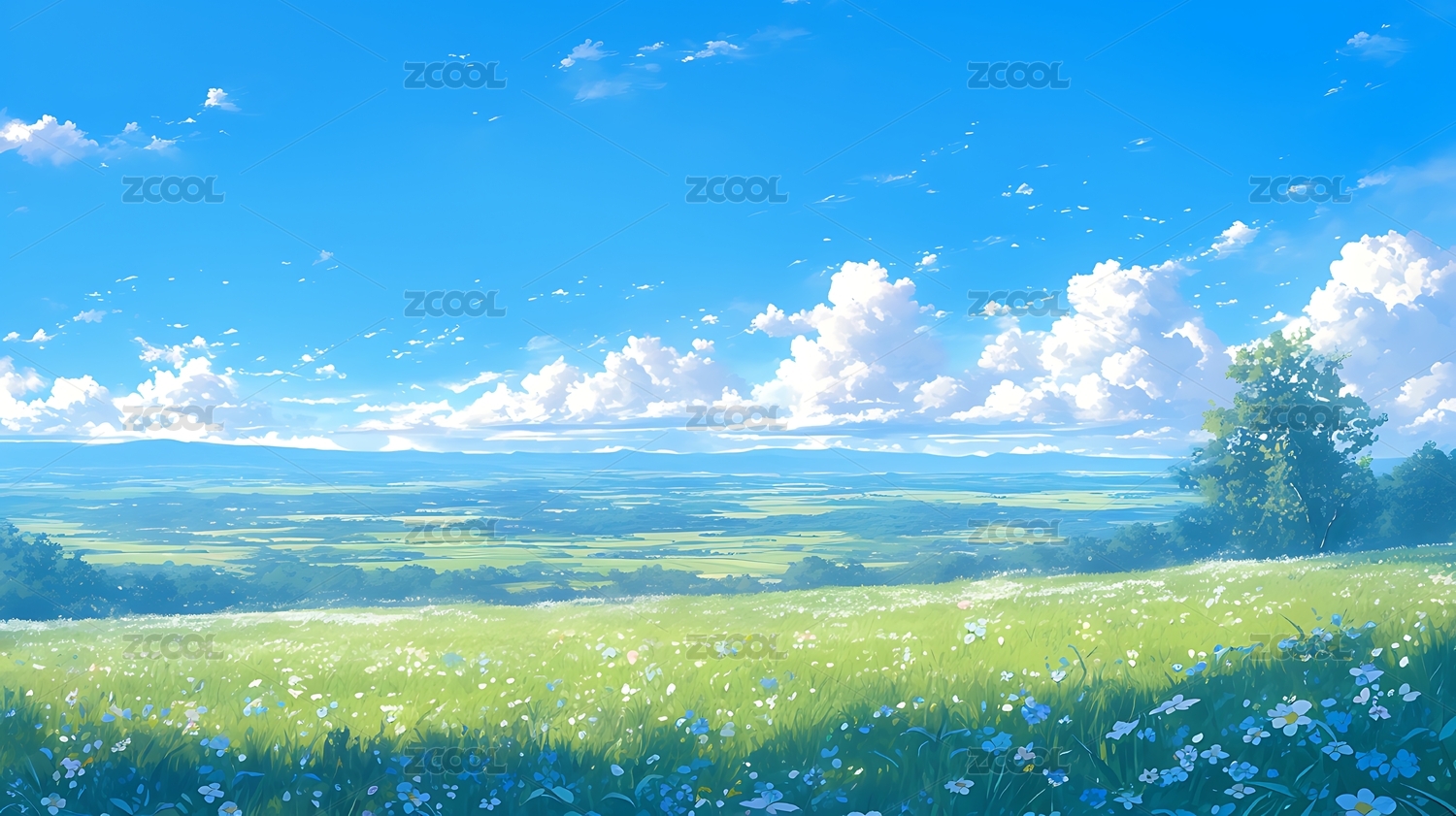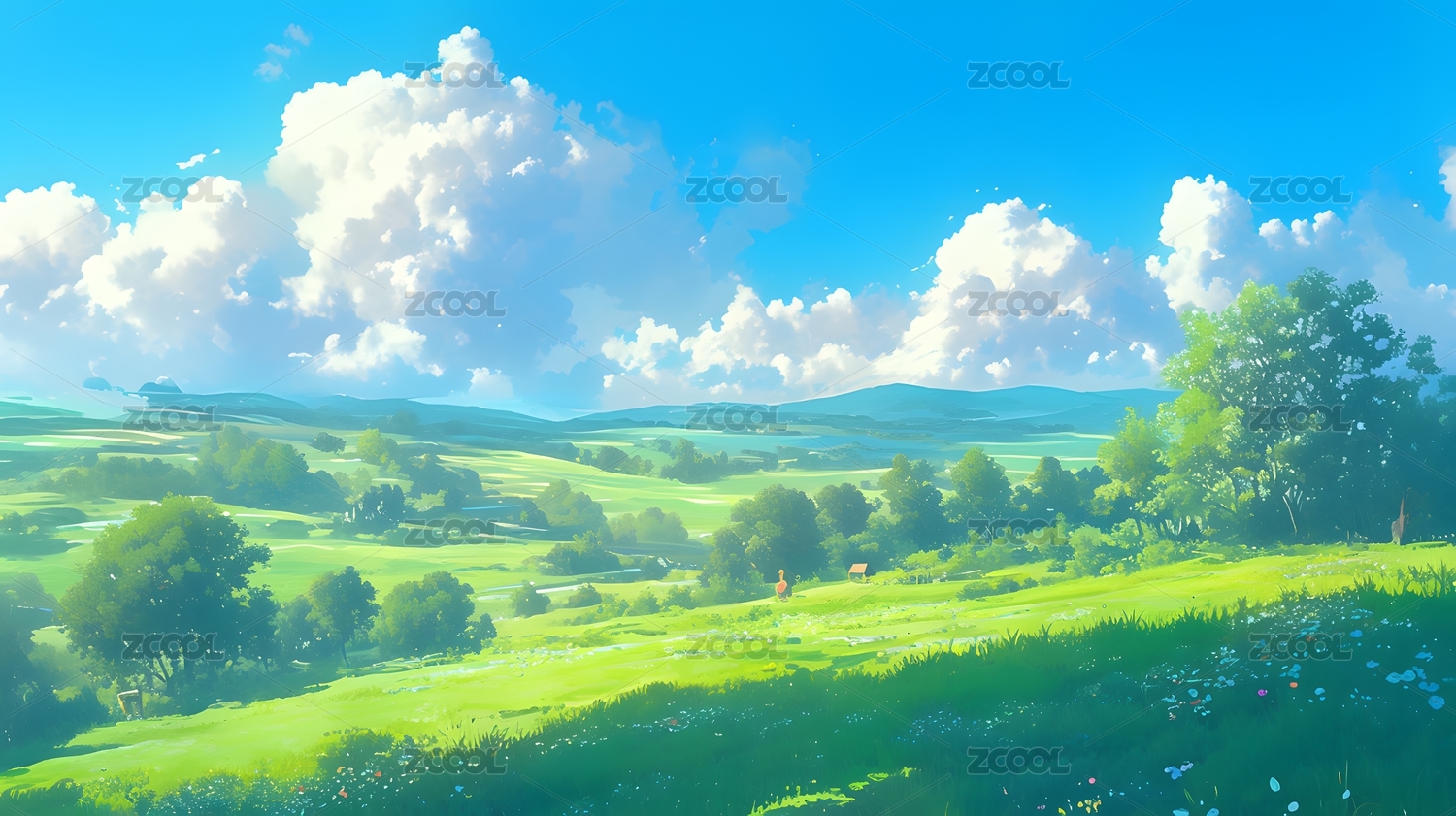 日漫风格 草地天空云朵自然风景