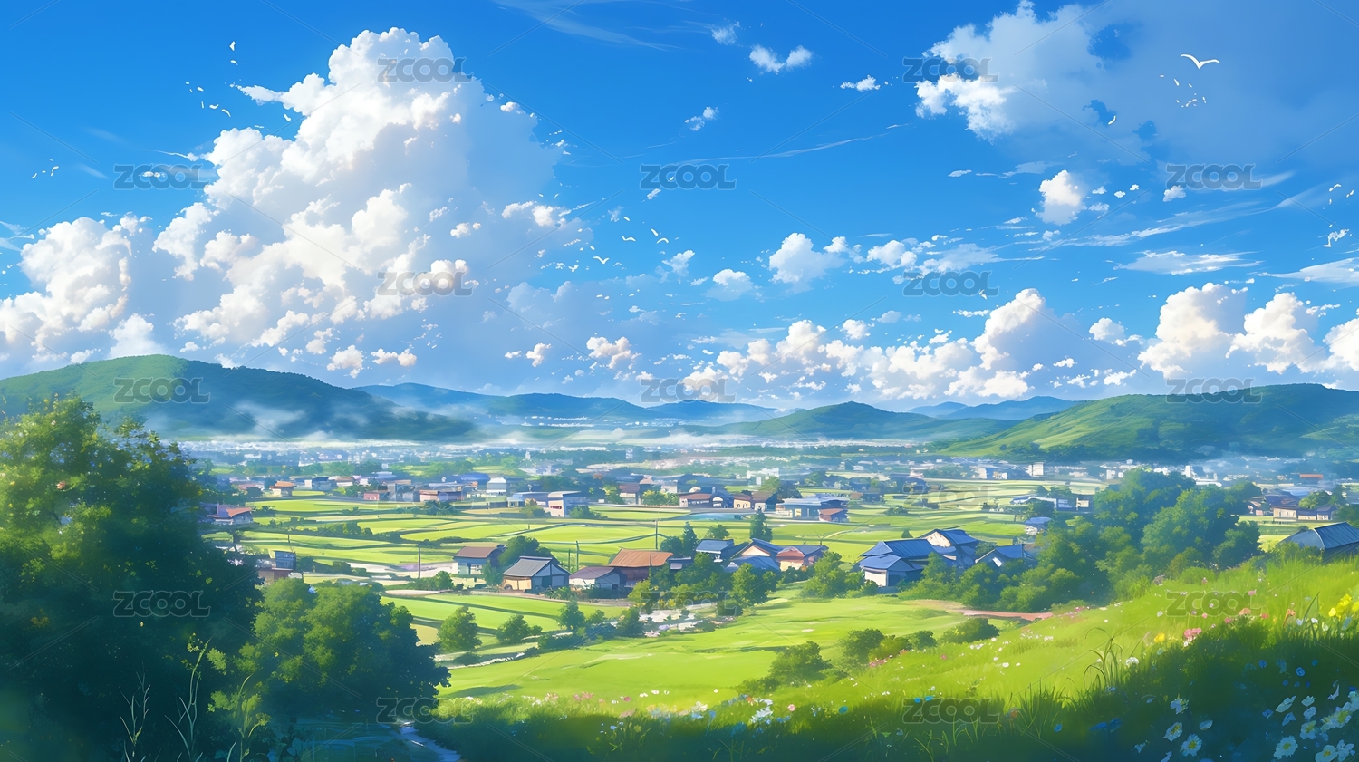 乡村小镇风景新海诚动漫风格插画