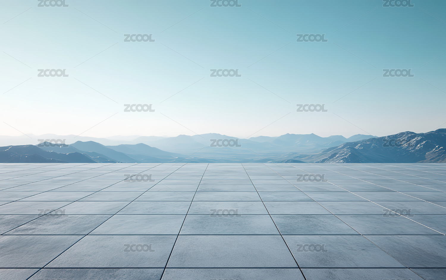 宽阔无人的混泥土地面以层层山峰为背景