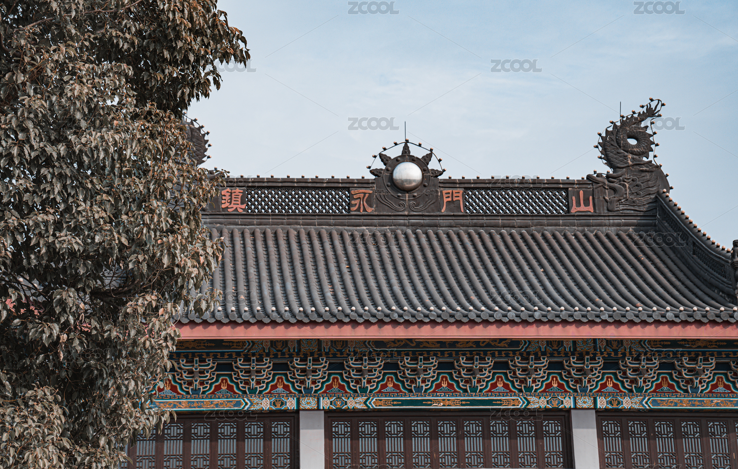 蓝天下秋季红色枫叶与古建筑屋檐美景,中国江苏省南京市栖霞山栖霞寺