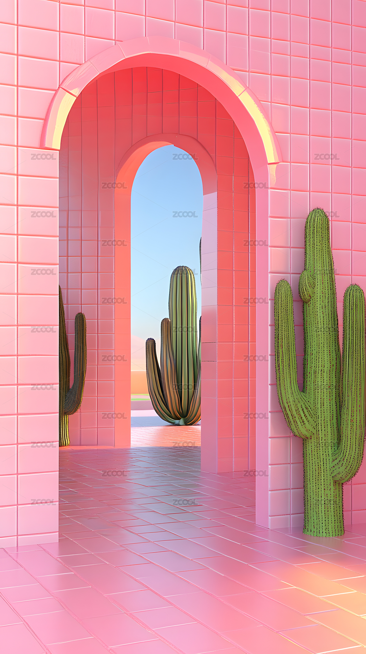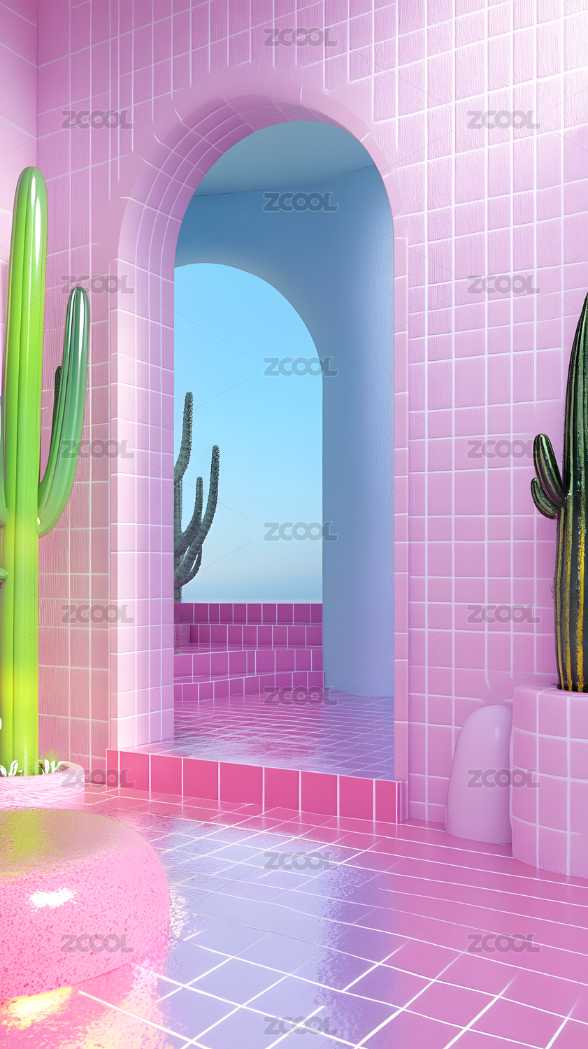 粉色瓷砖拱门仙人掌室内空间