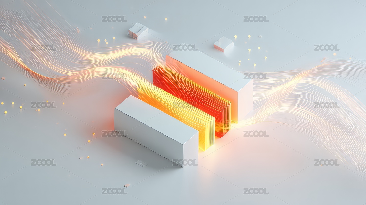 白色方块与金色光线交织的抽象艺术