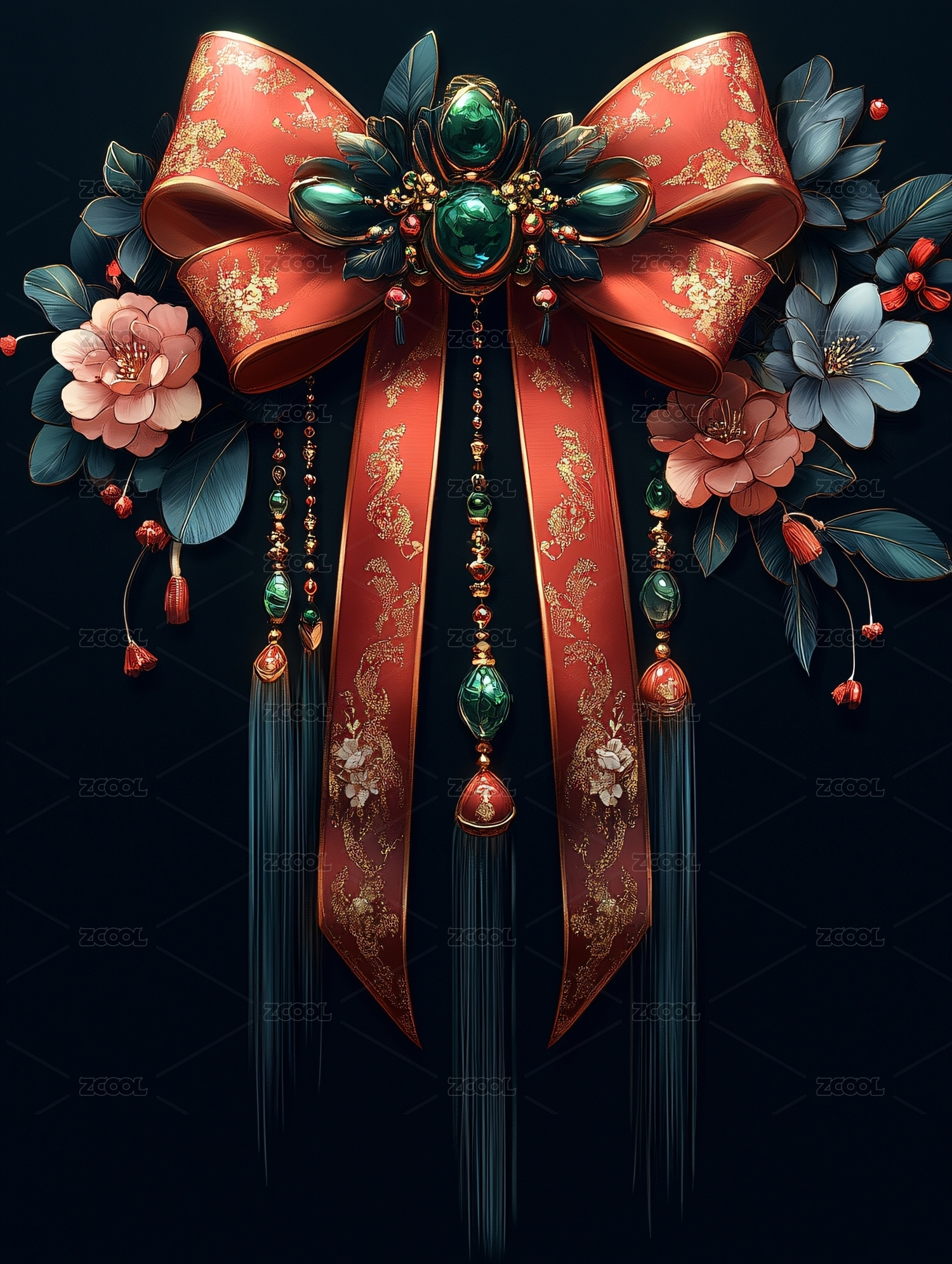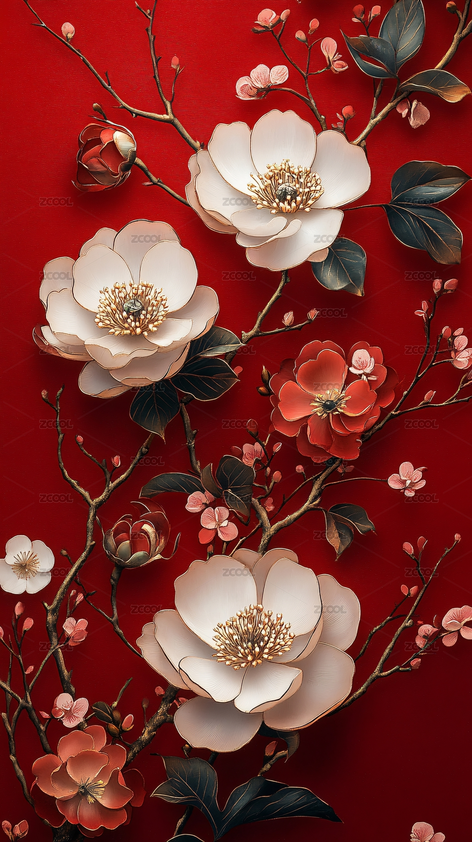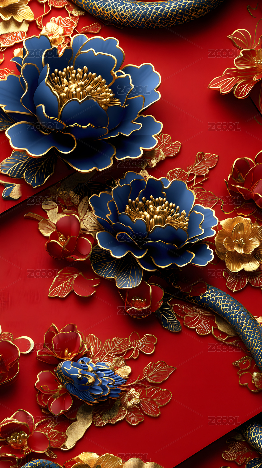 挂饰,花卉,花朵,花瓣,花蕊,叶片,金边,蓝叶,红墙,背景
