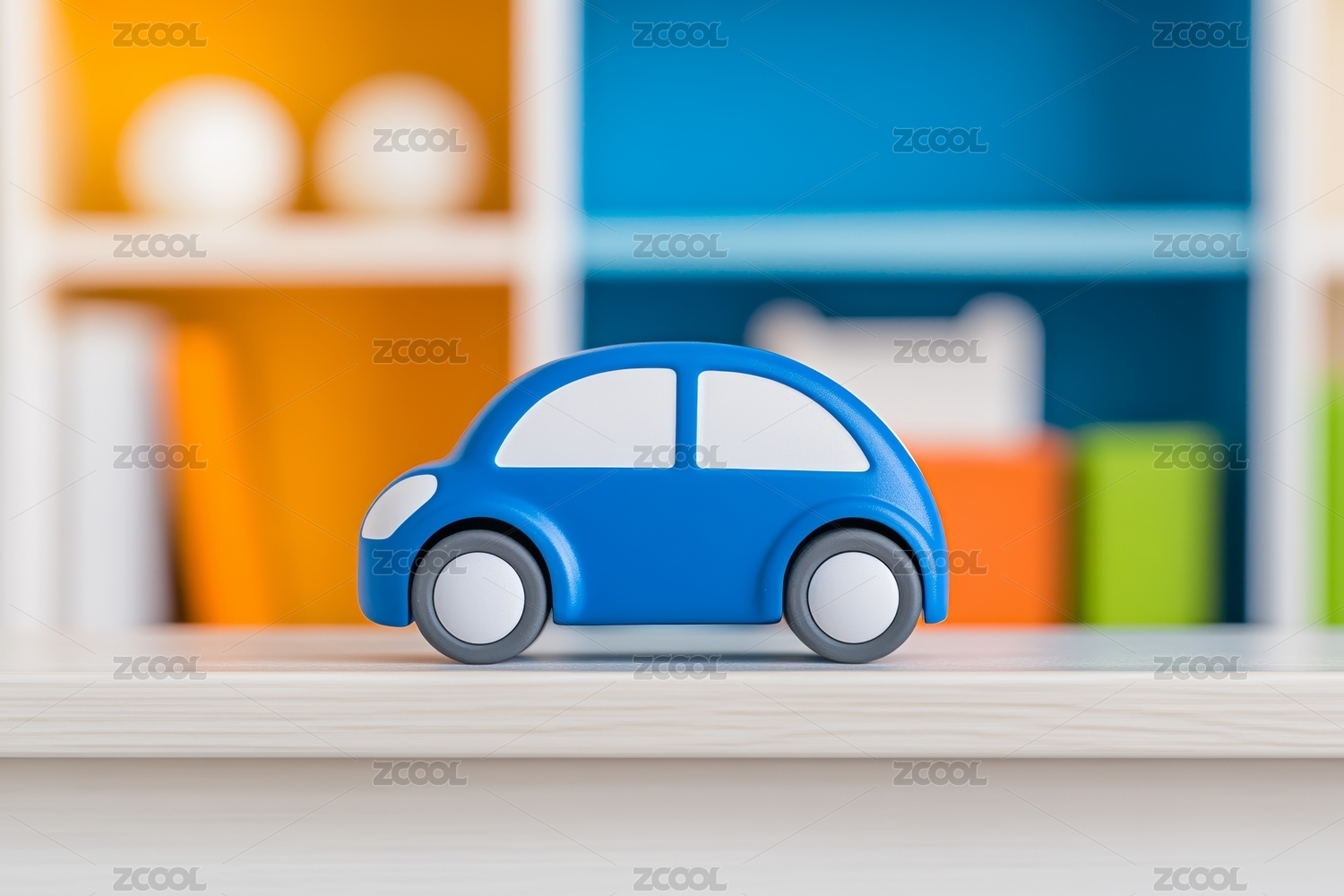 蓝色玩具车在书架前