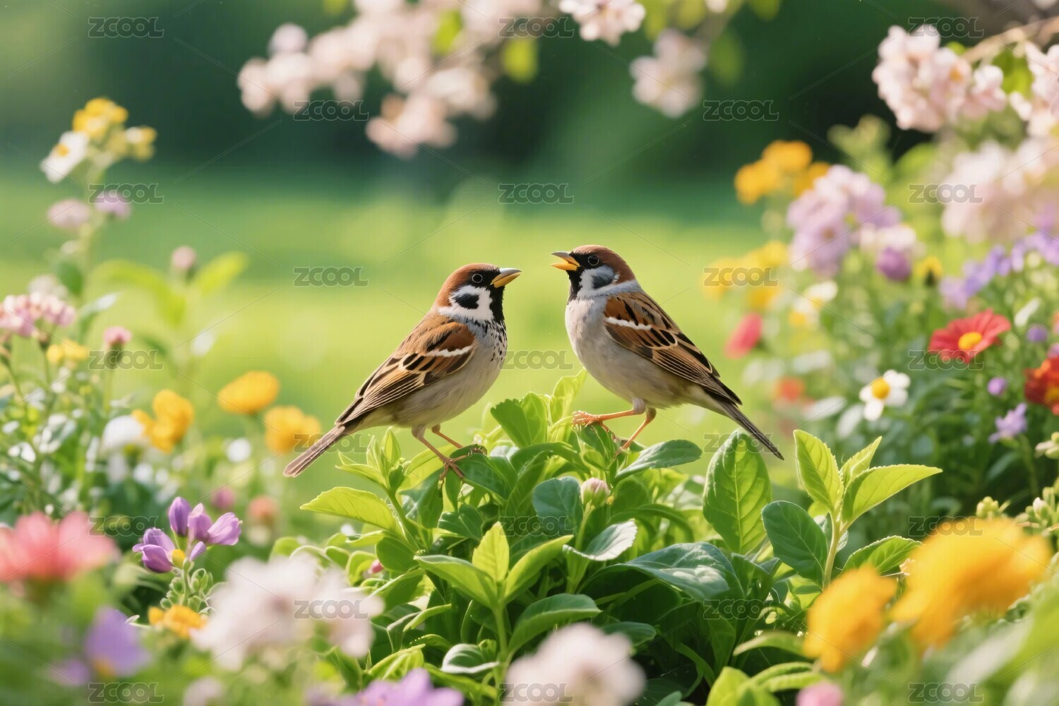 春天里两只麻雀在花丛中