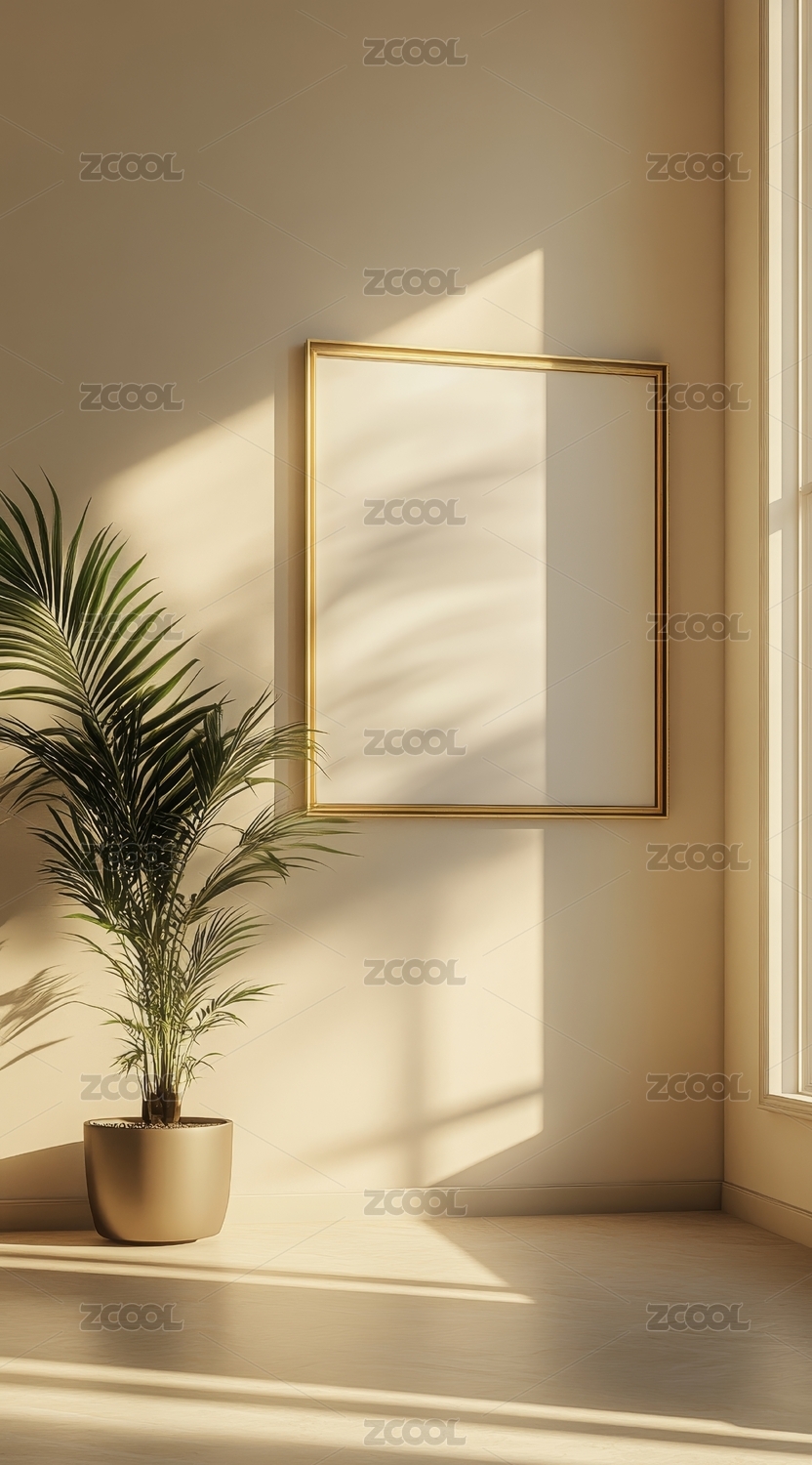 窗边光影下的画框绿植与织物