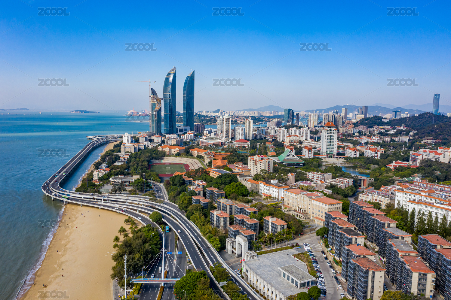 中国福建厦门思明区双子塔、白城沙滩与厦门大学