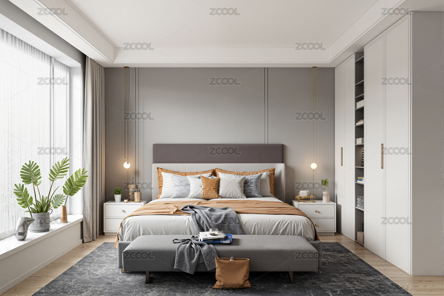 卧室,现代,设计,橙色,床,吊灯,装饰画,地毯,窗帘