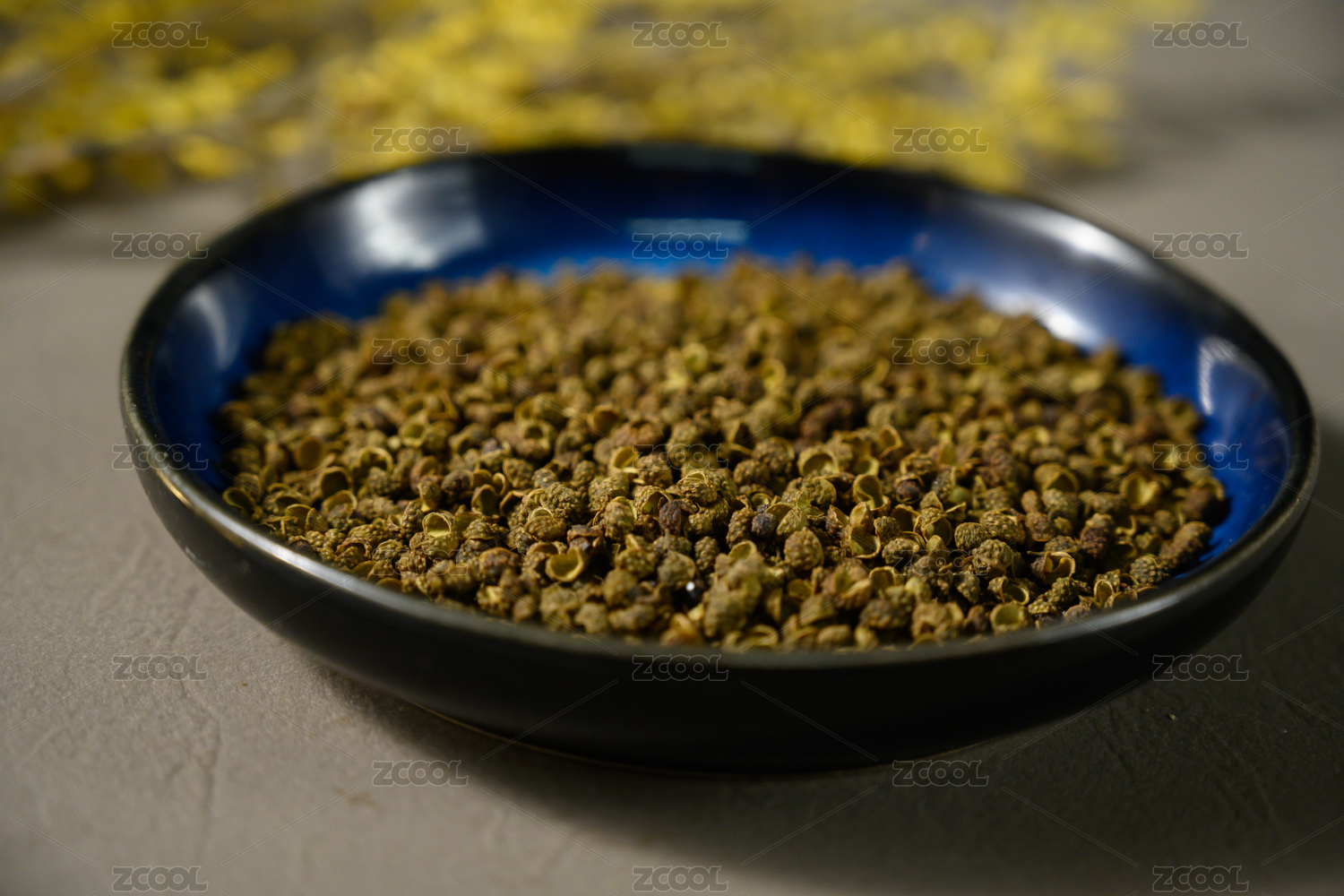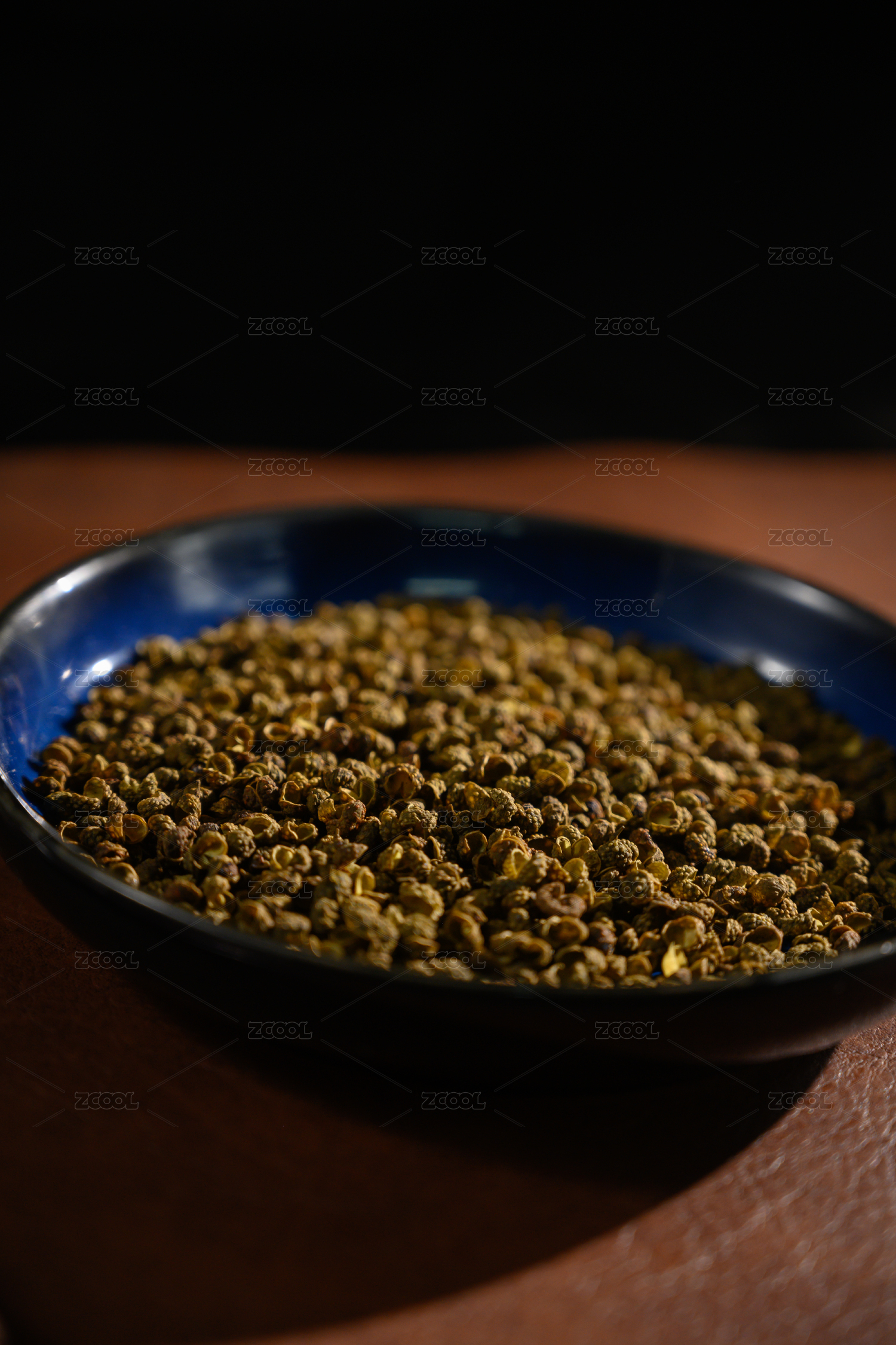 桌面上的盘子里的干爽的青花椒
