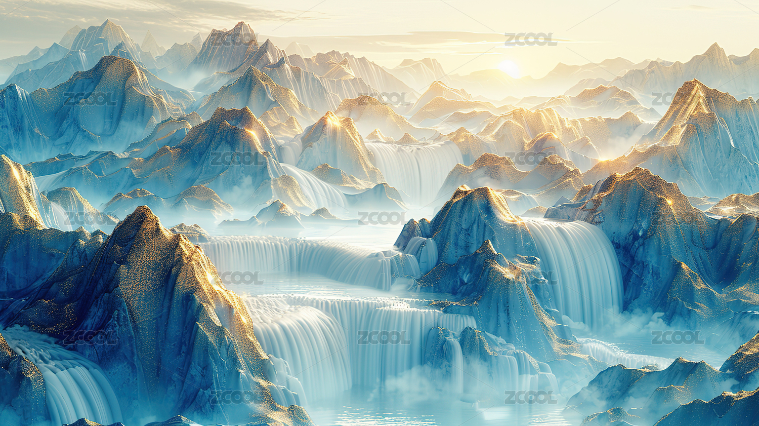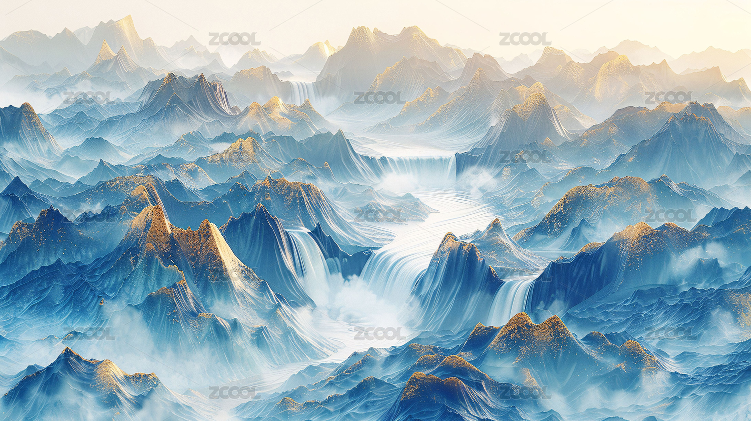 金色河流蜿蜒穿过蓝色山脉