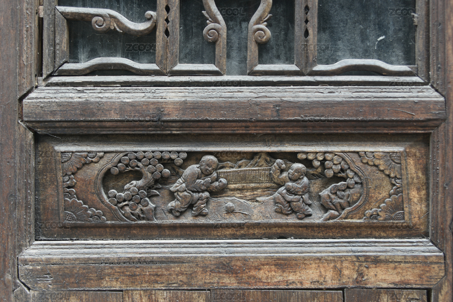 深圳甘坑客家小镇民房木格门窗雕花童子嬉戏
