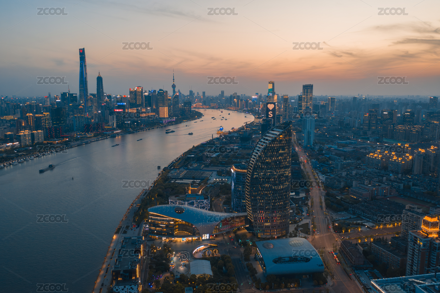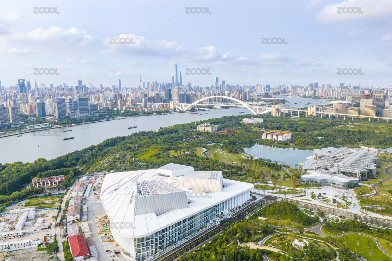 航拍上海世博文化公园卢浦大桥陆家嘴城市天