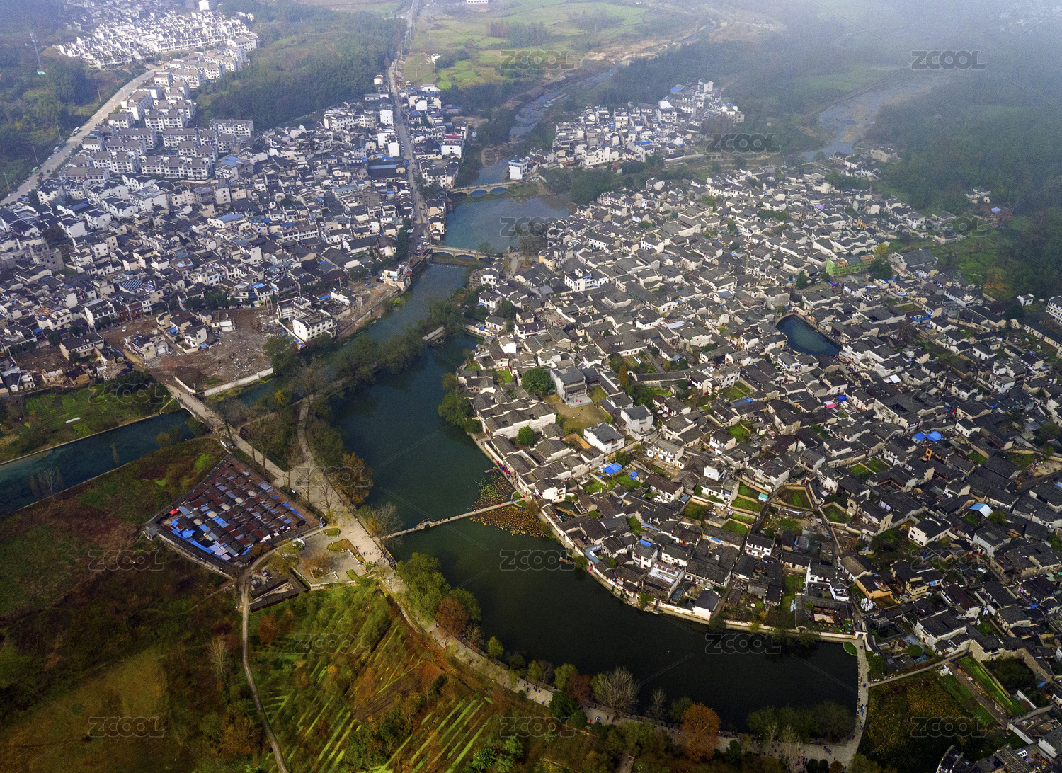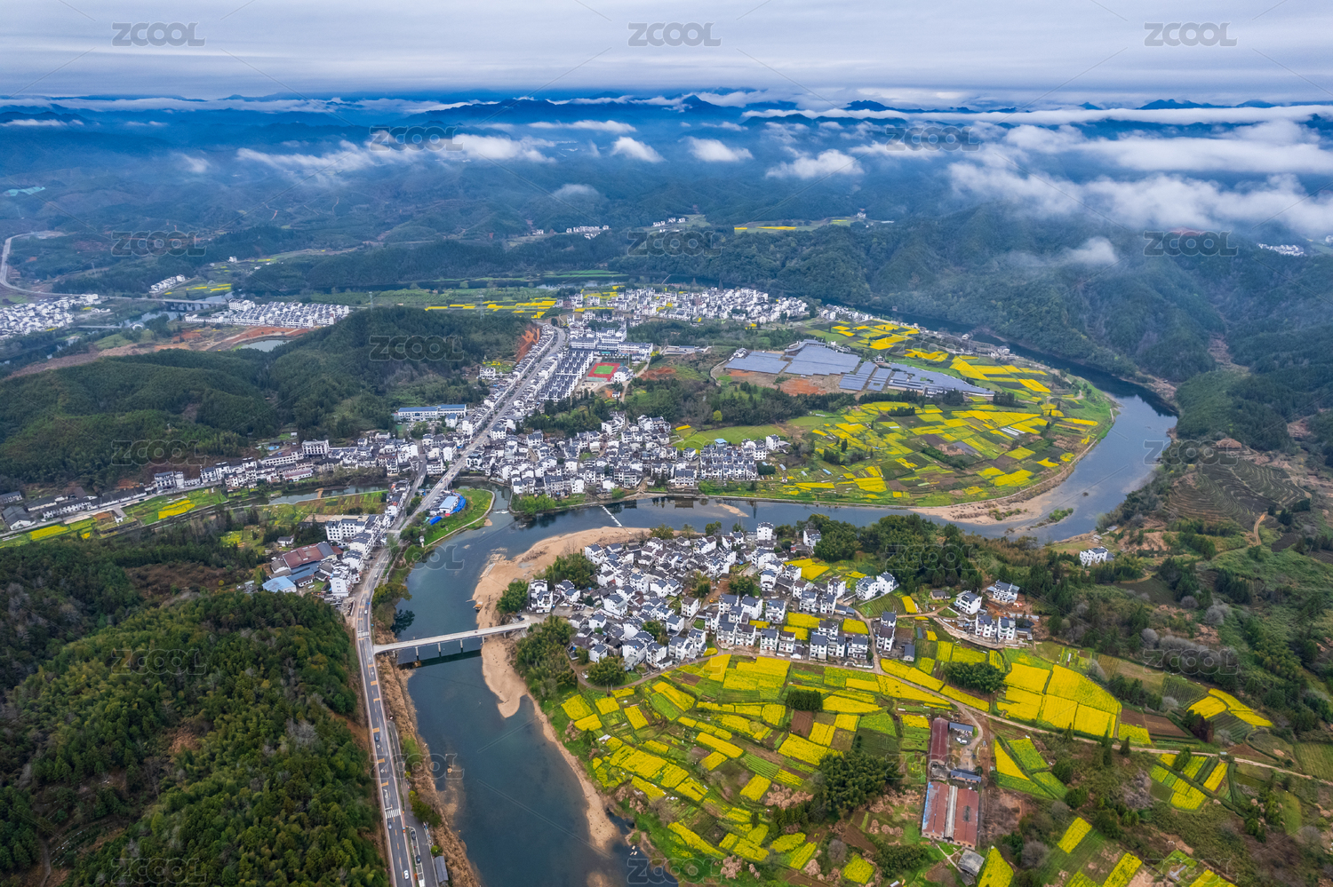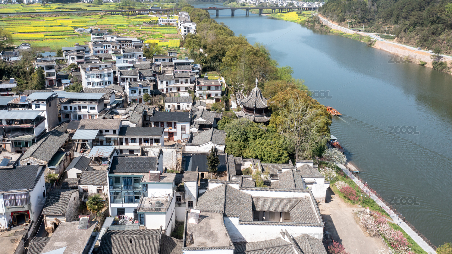 航拍,河流,宁静,乡村,道路,水乡,村庄,聚落,徽派建筑,皖南