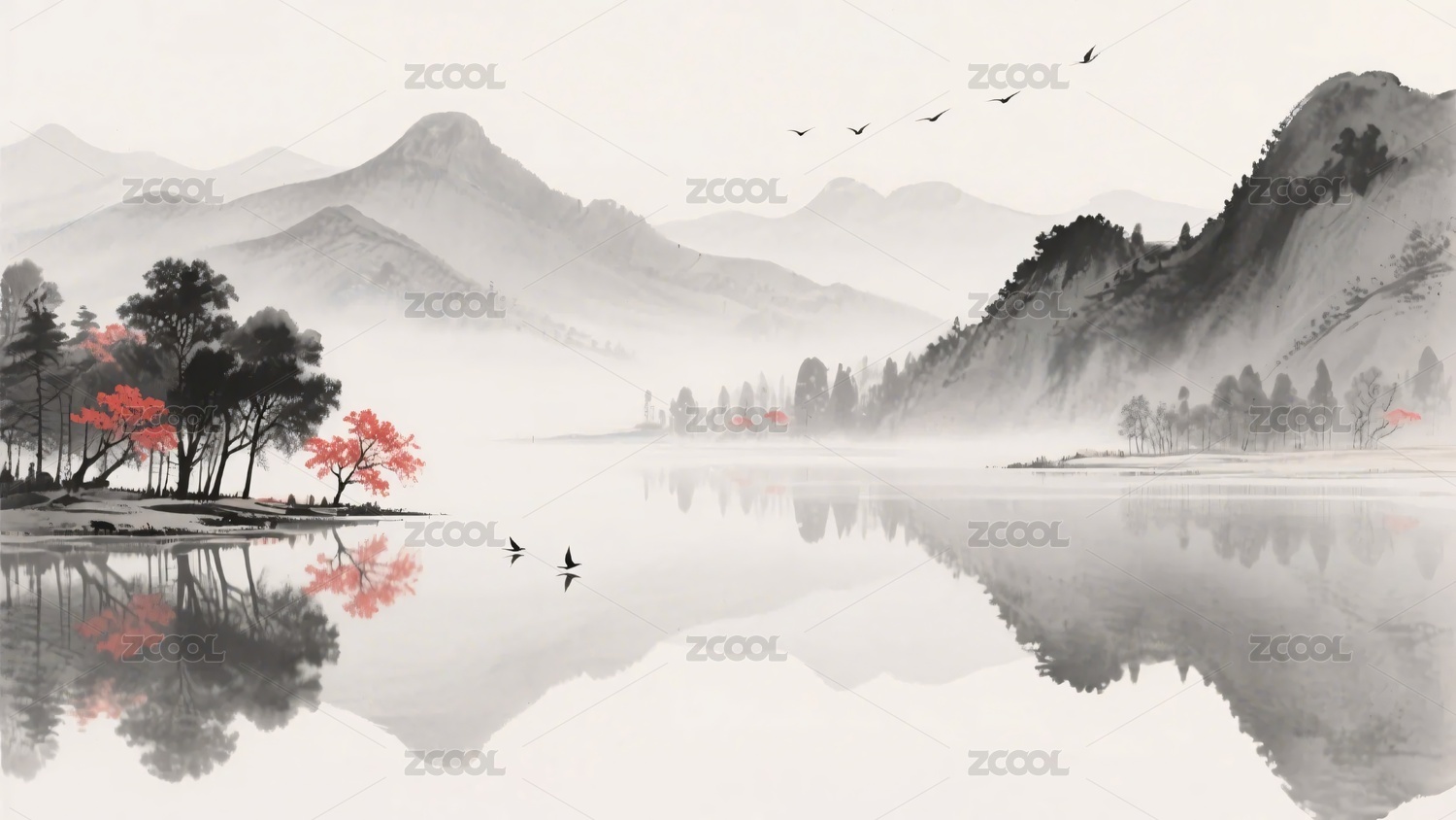 水墨山水静谧湖景图
